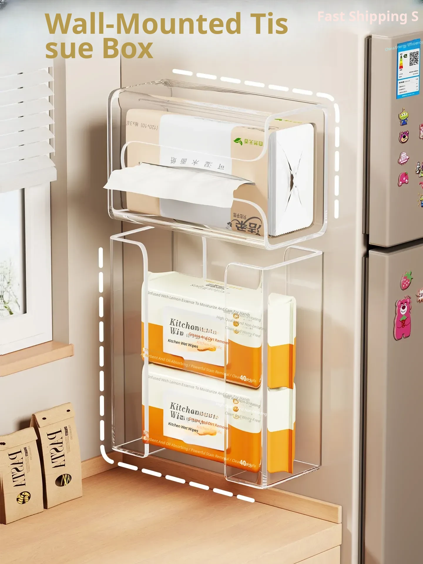 Wall-Mounted Tissue Box for Kitchen - Adjustable, No-Drill Design for Wet Wipes and Facial Towels - Stylish Storage Solution for Organized Spaces