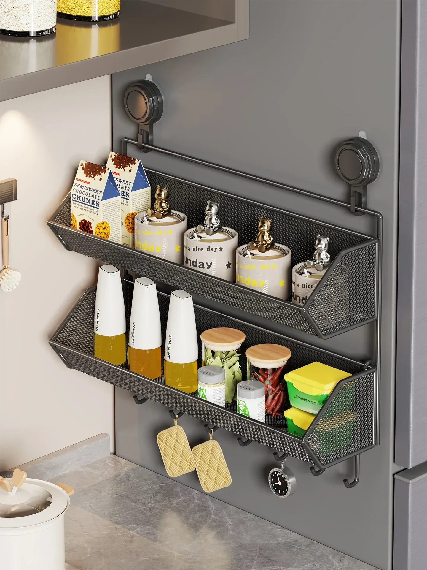 Powerful Suction Wall-Mounted Kitchen Refrigerator Side Shelf - No Drilling Required, Multi-Layer Storage Organizer for Spices and Condiments