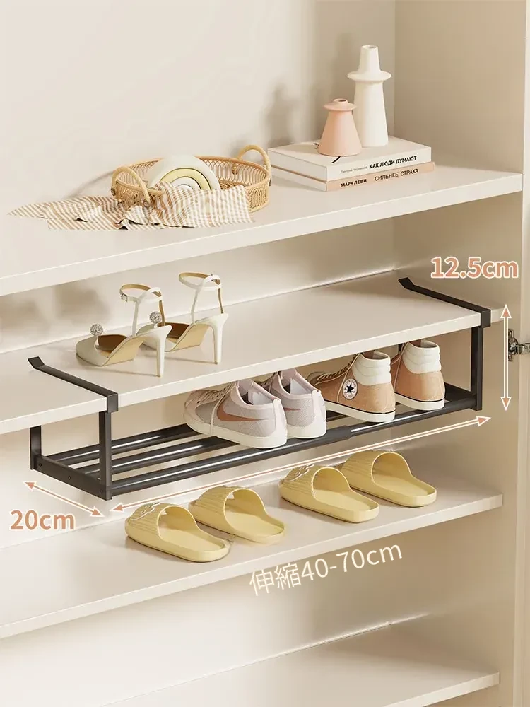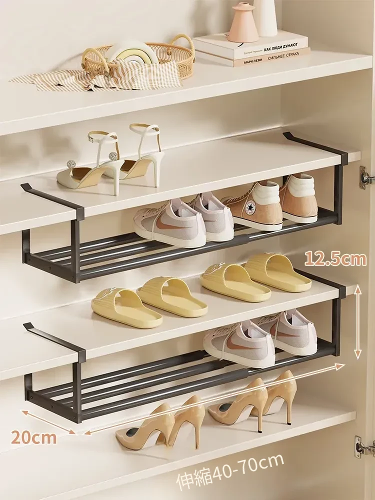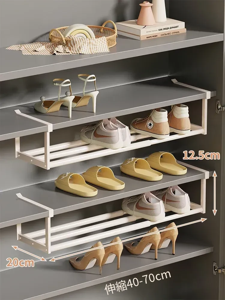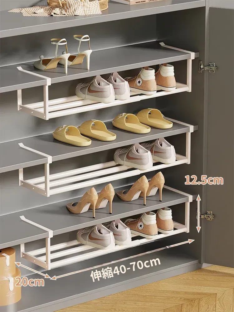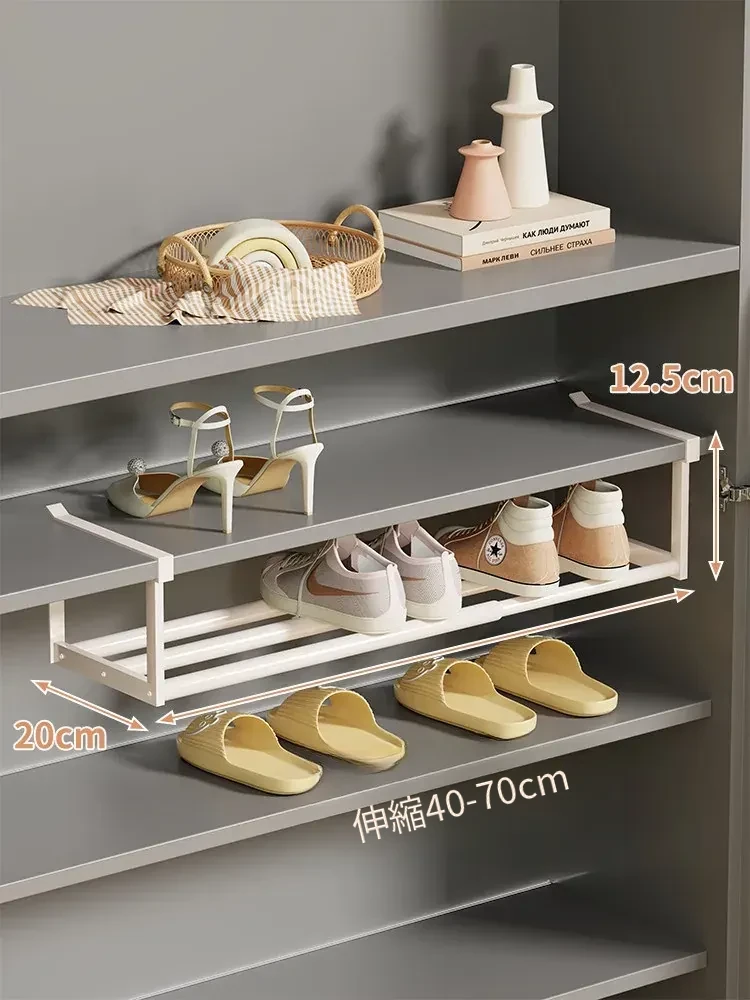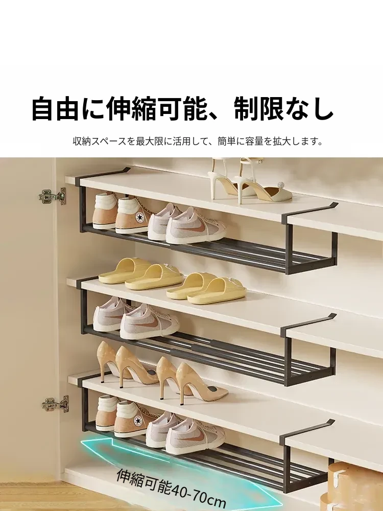 伸縮式収納シューラック - クローゼット内で靴を整理整頓!家のキャビネットにぴったりの分隔板で、スペースを有効活用し、おしゃれに靴を収納。あなたの靴を美しく整えます!