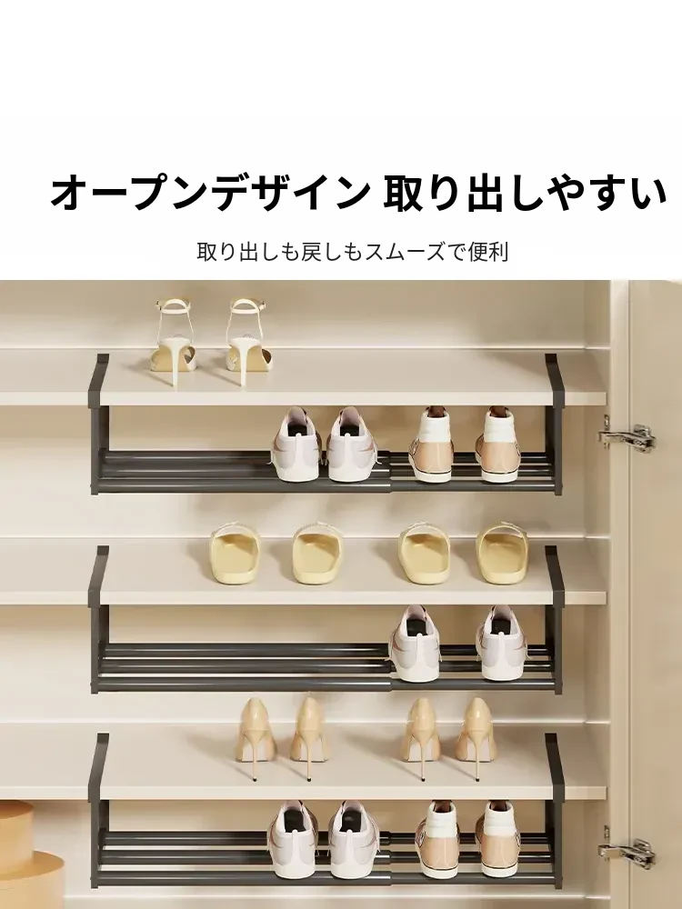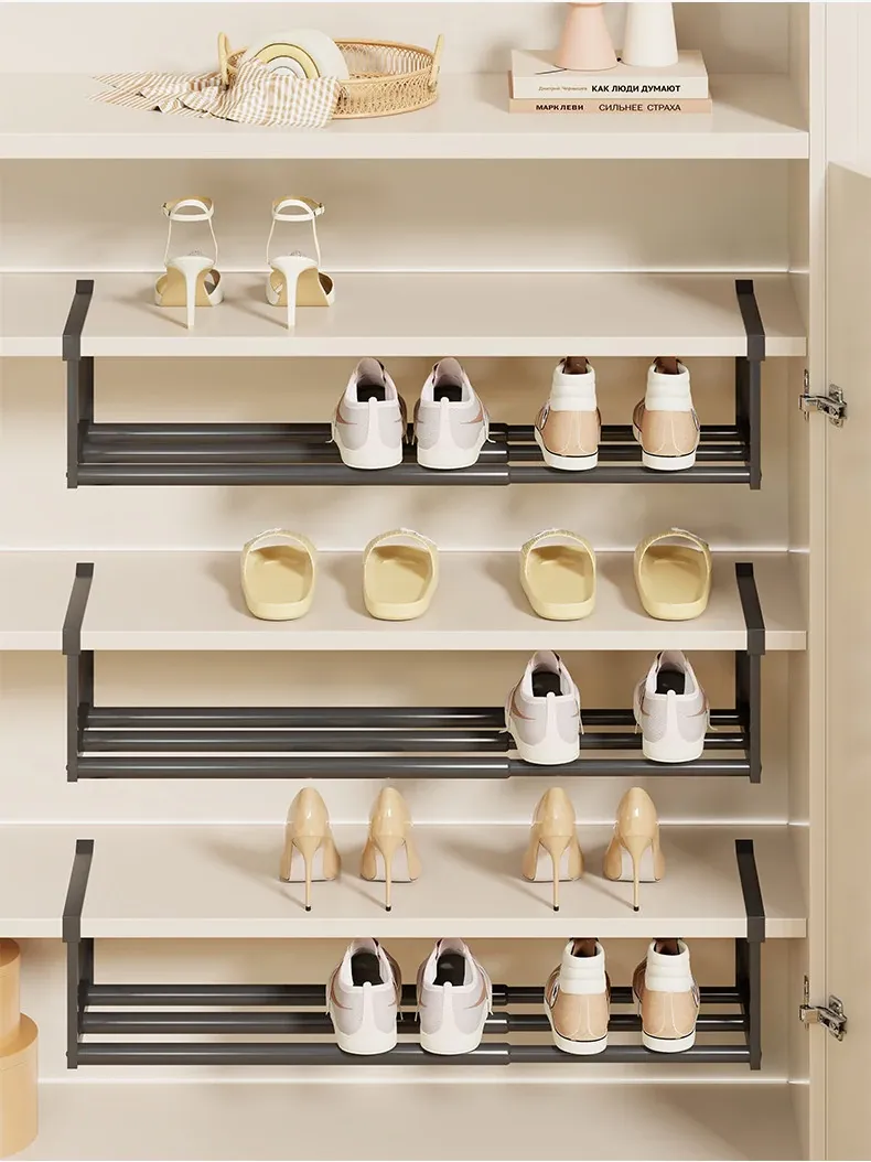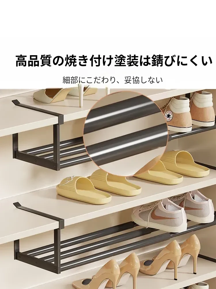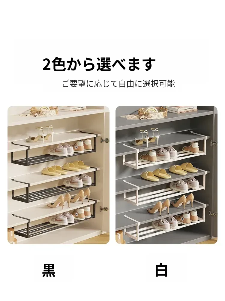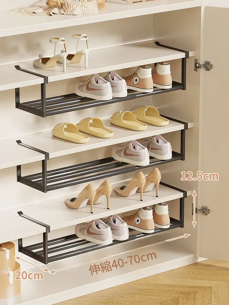 伸縮式収納シューラック - クローゼット内で靴を整理整頓!家のキャビネットにぴったりの分隔板で、スペースを有効活用し、おしゃれに靴を収納。あなたの靴を美しく整えます!