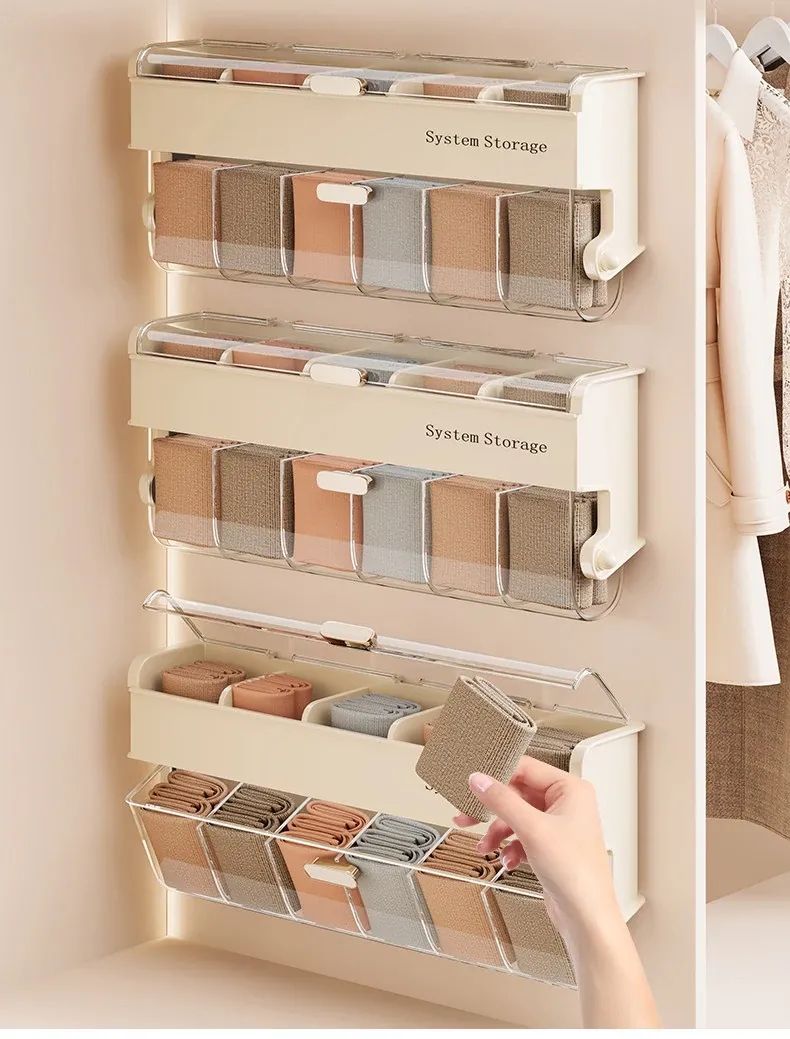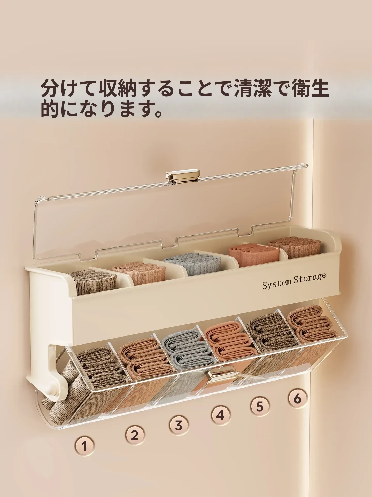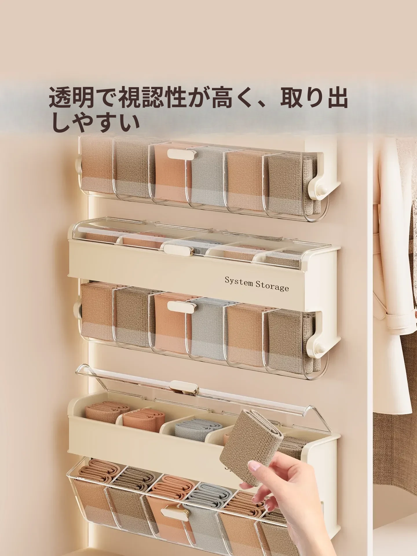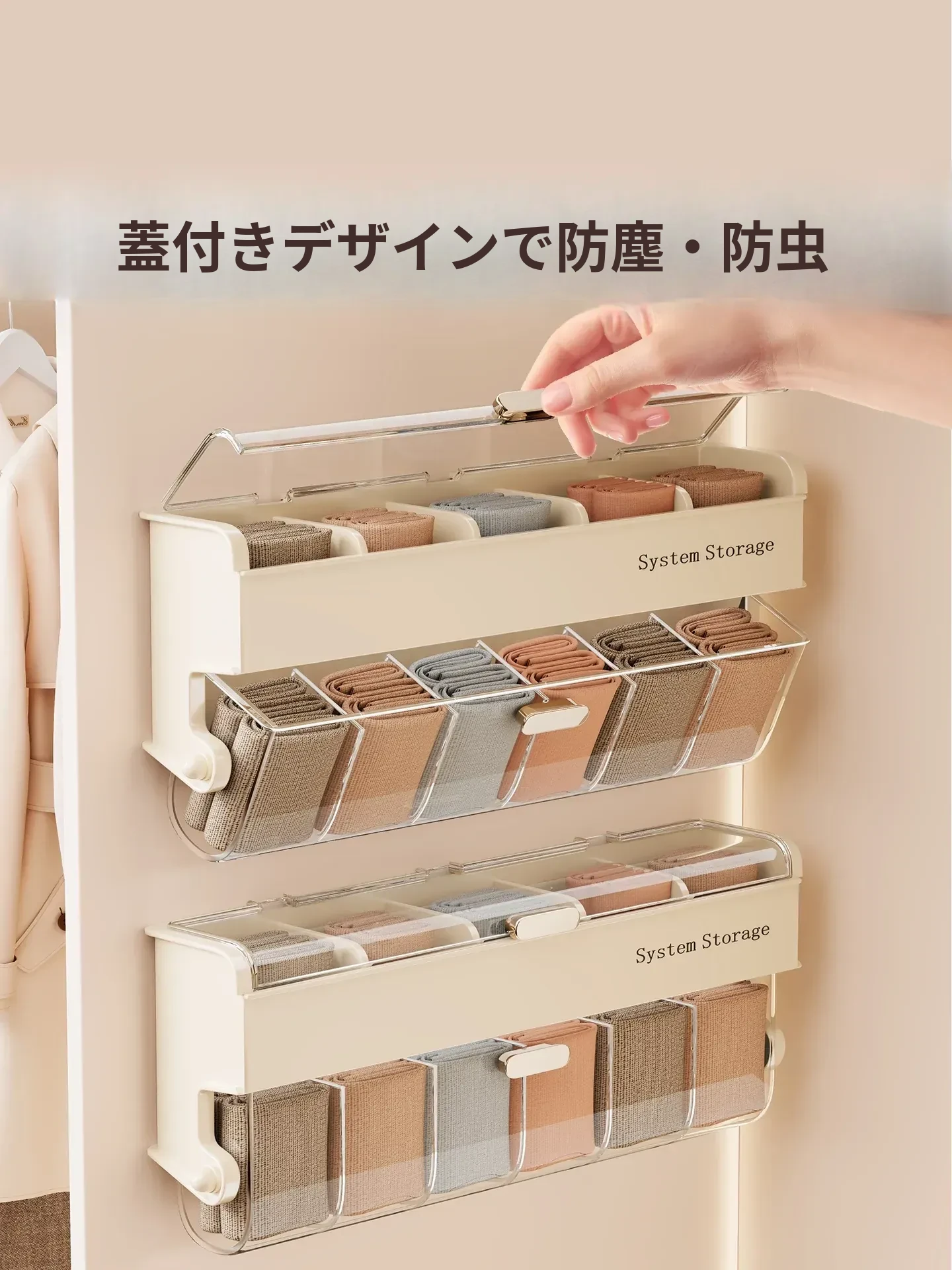 収納力抜群!ソックス収納ボックス - 蓋付き・仕切り付き・壁掛け式で、寝室のクローゼットドアの裏にピッタリ!下着やパンツもスッキリ整理できる便利アイテムです。