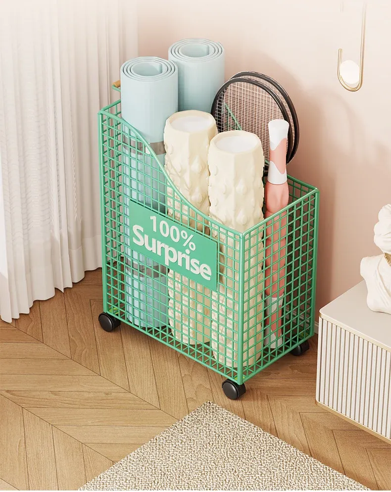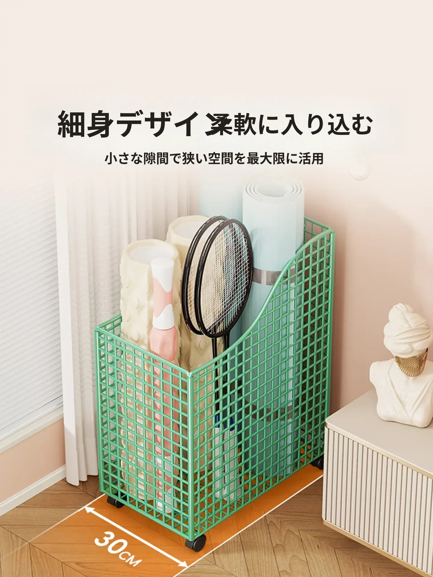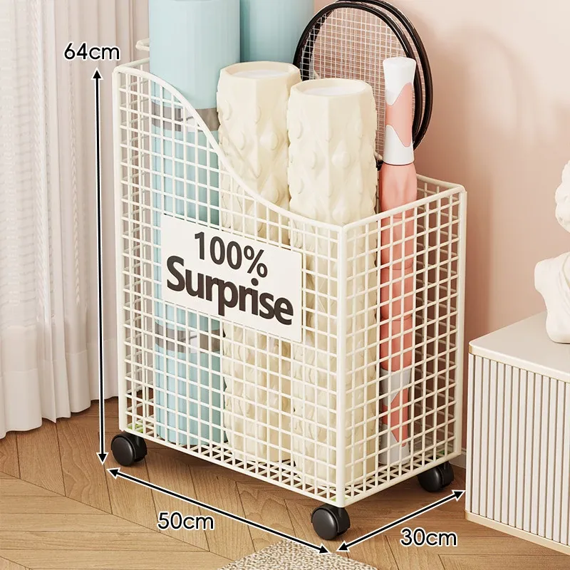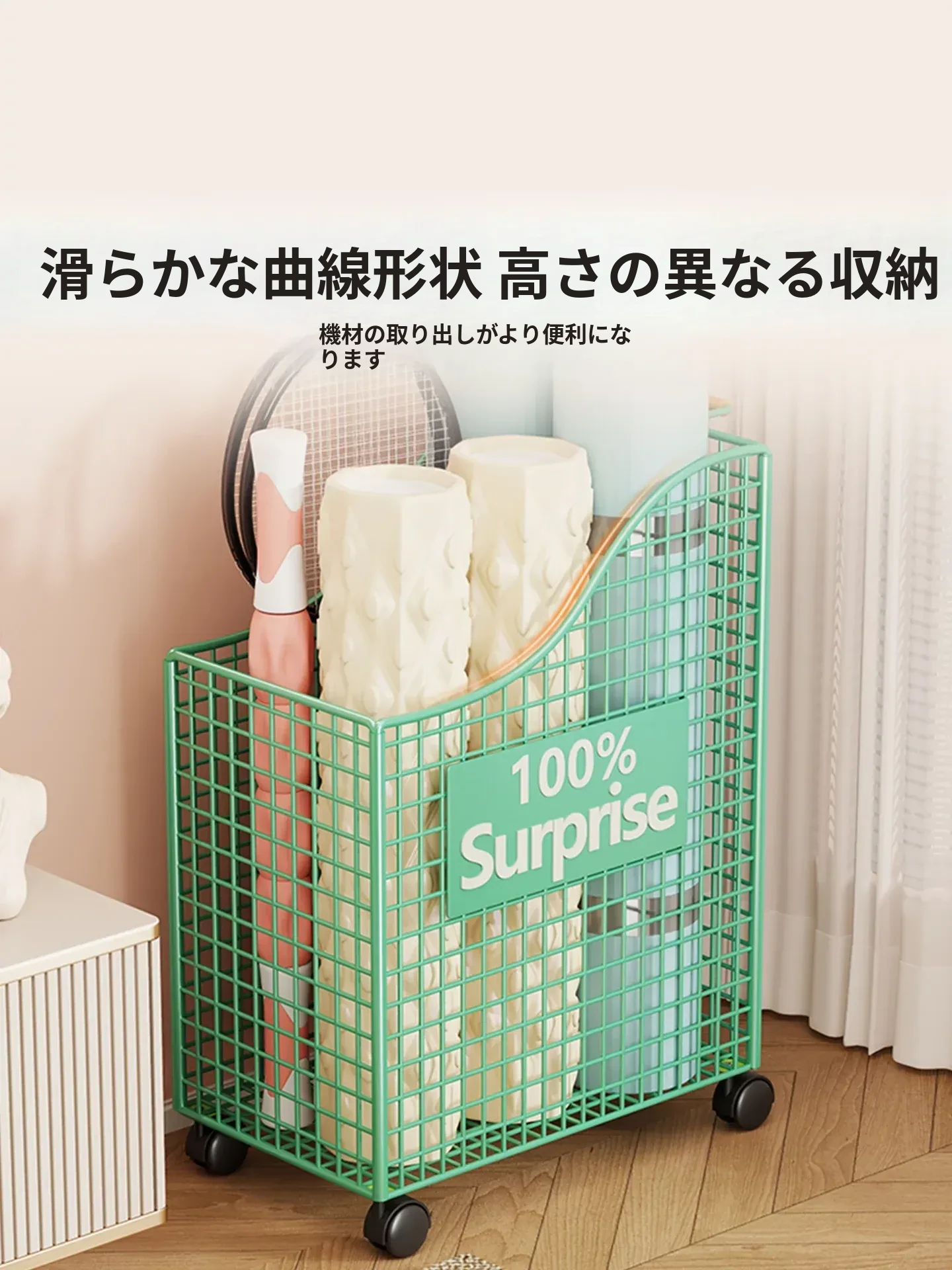 ヨガマット収納バスケット 家庭用 大容量キャスター付き フォームローラー 健康器具 多機能スリム収納ラック - スペースを有効活用し、快適なトレーニング環境を実現!
