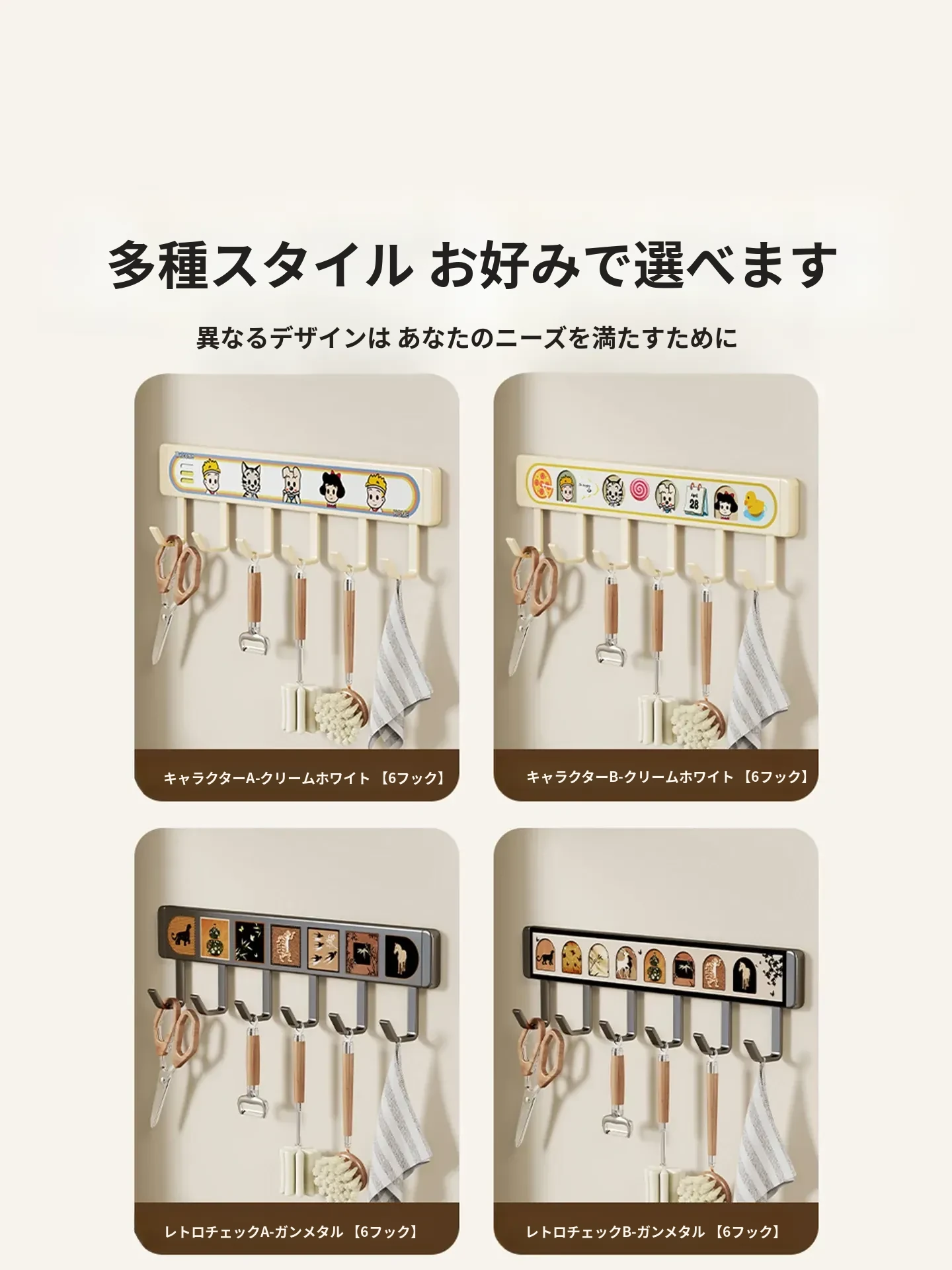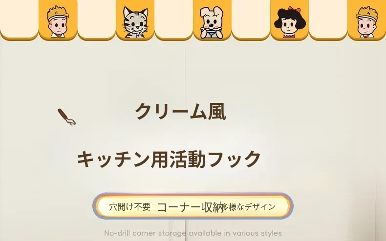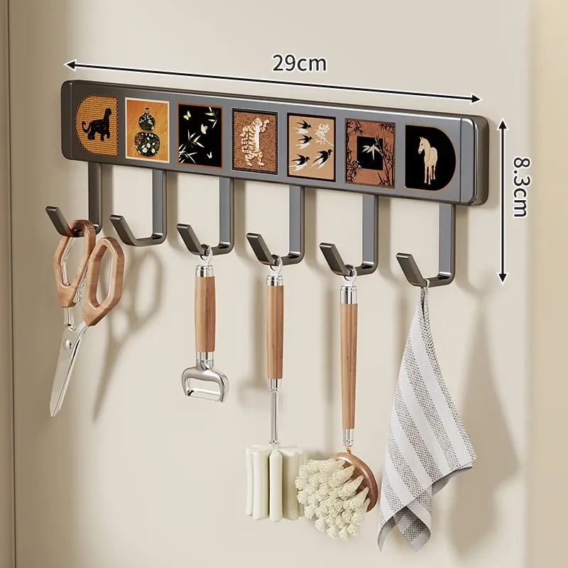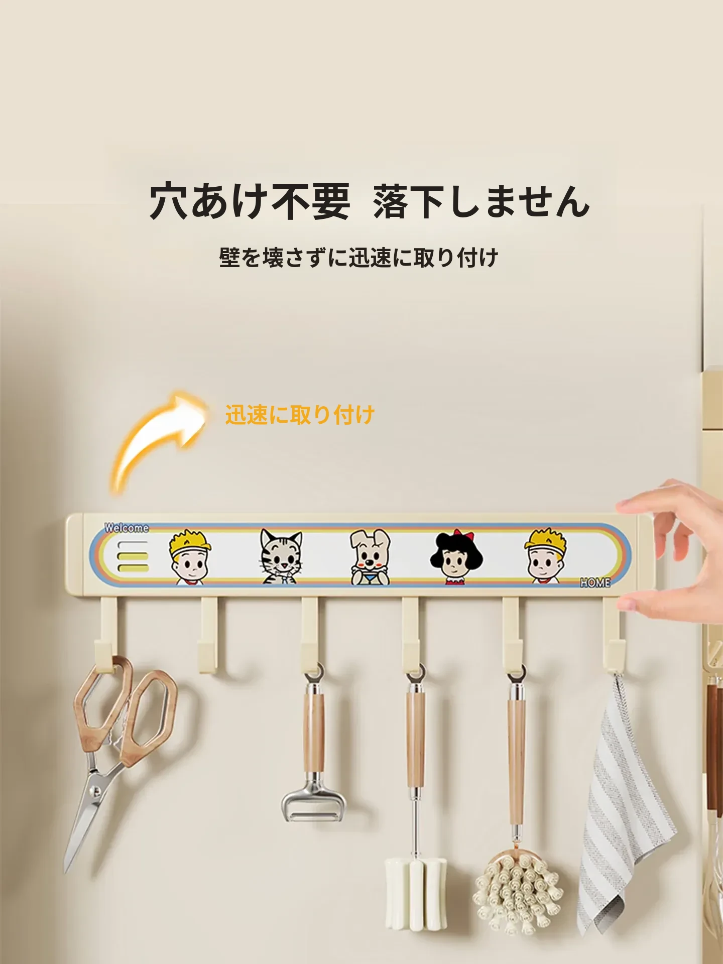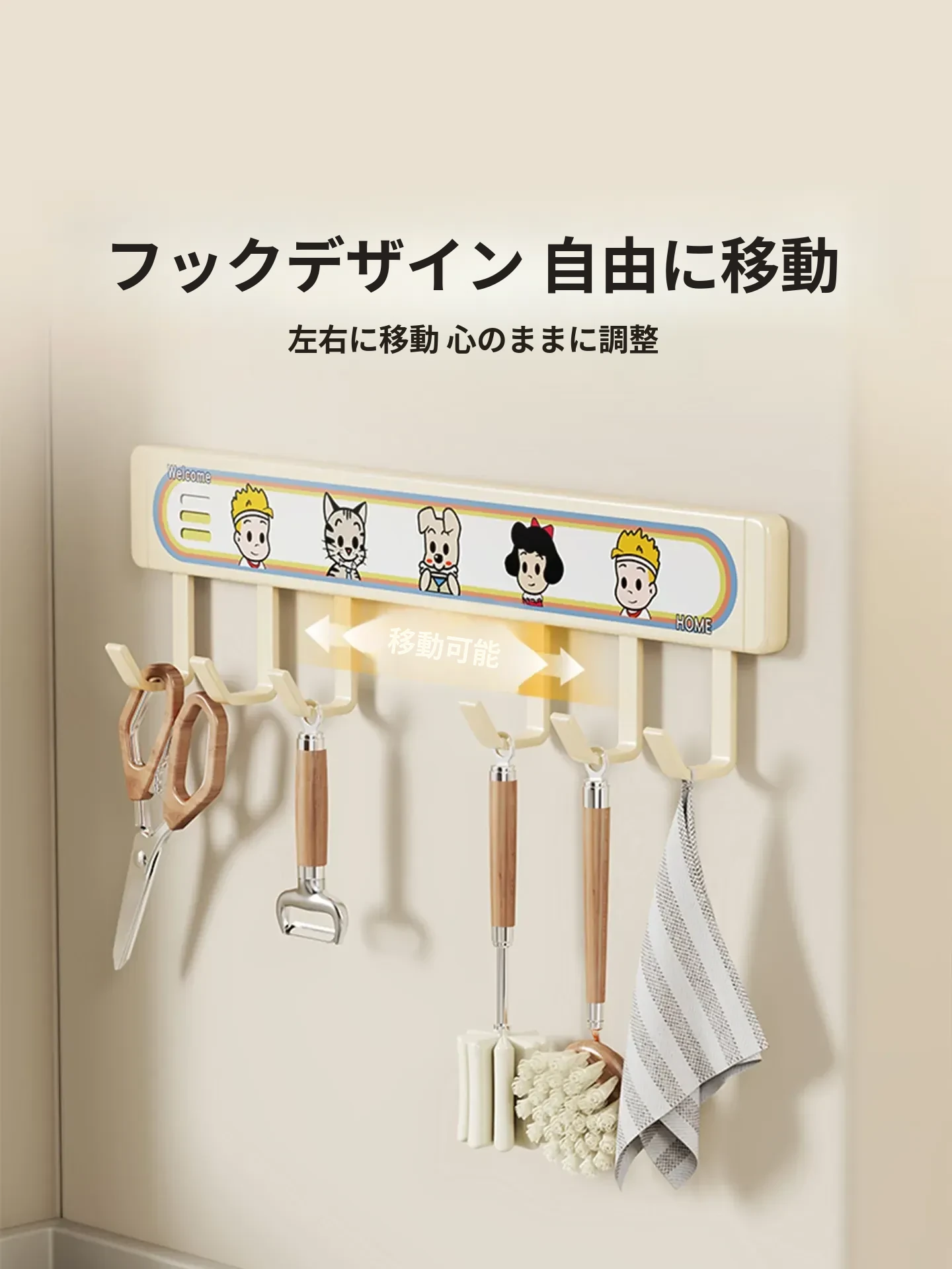 キッチン用フックラック - 壁に取り付けるだけで簡単収納!穴を開けずに使える便利な調理器具用フック、鍋やへら、スプーンなど多機能で整理整頓をサポートします。あなたのキッチンを美しく保つ必需品!