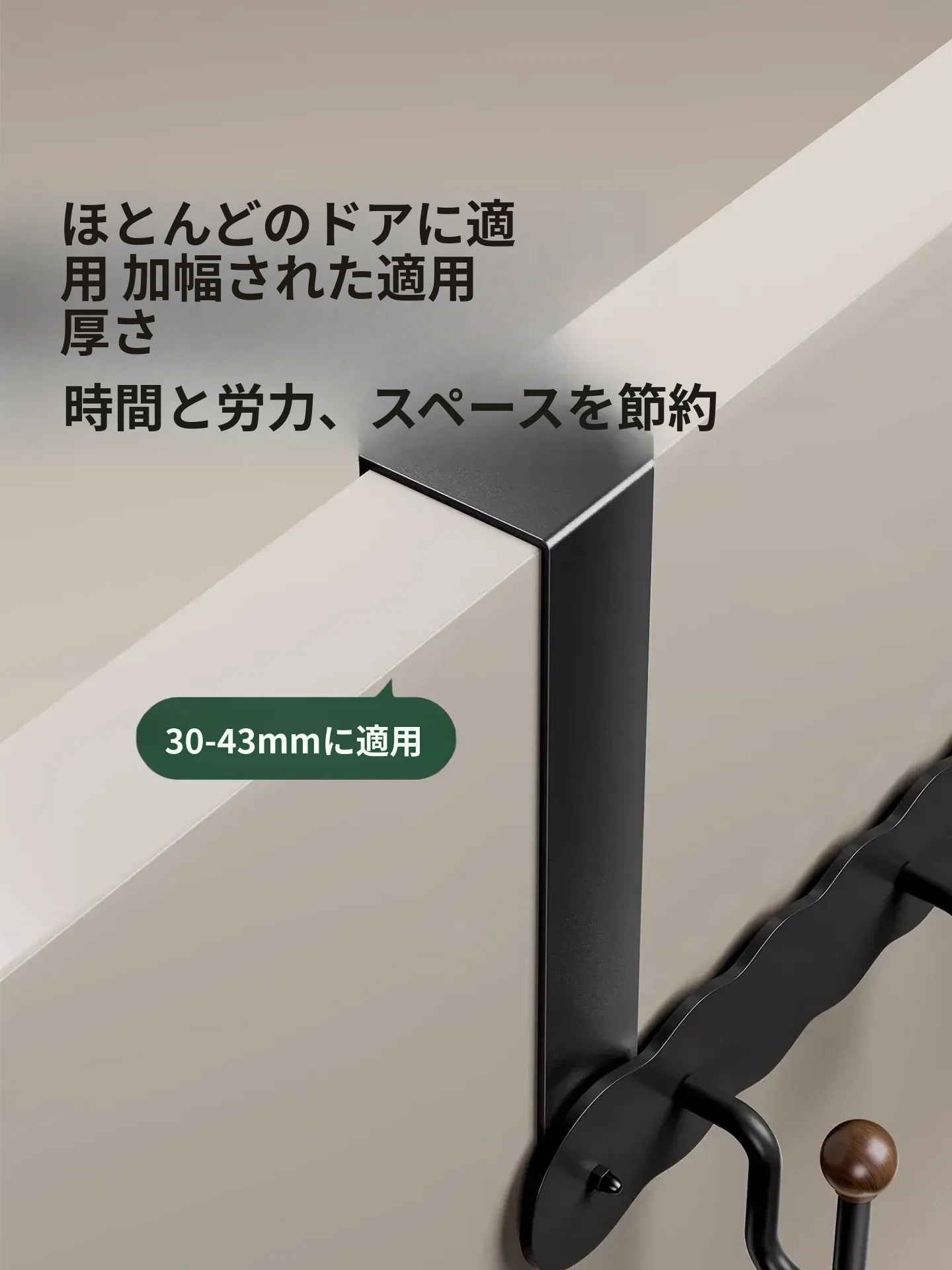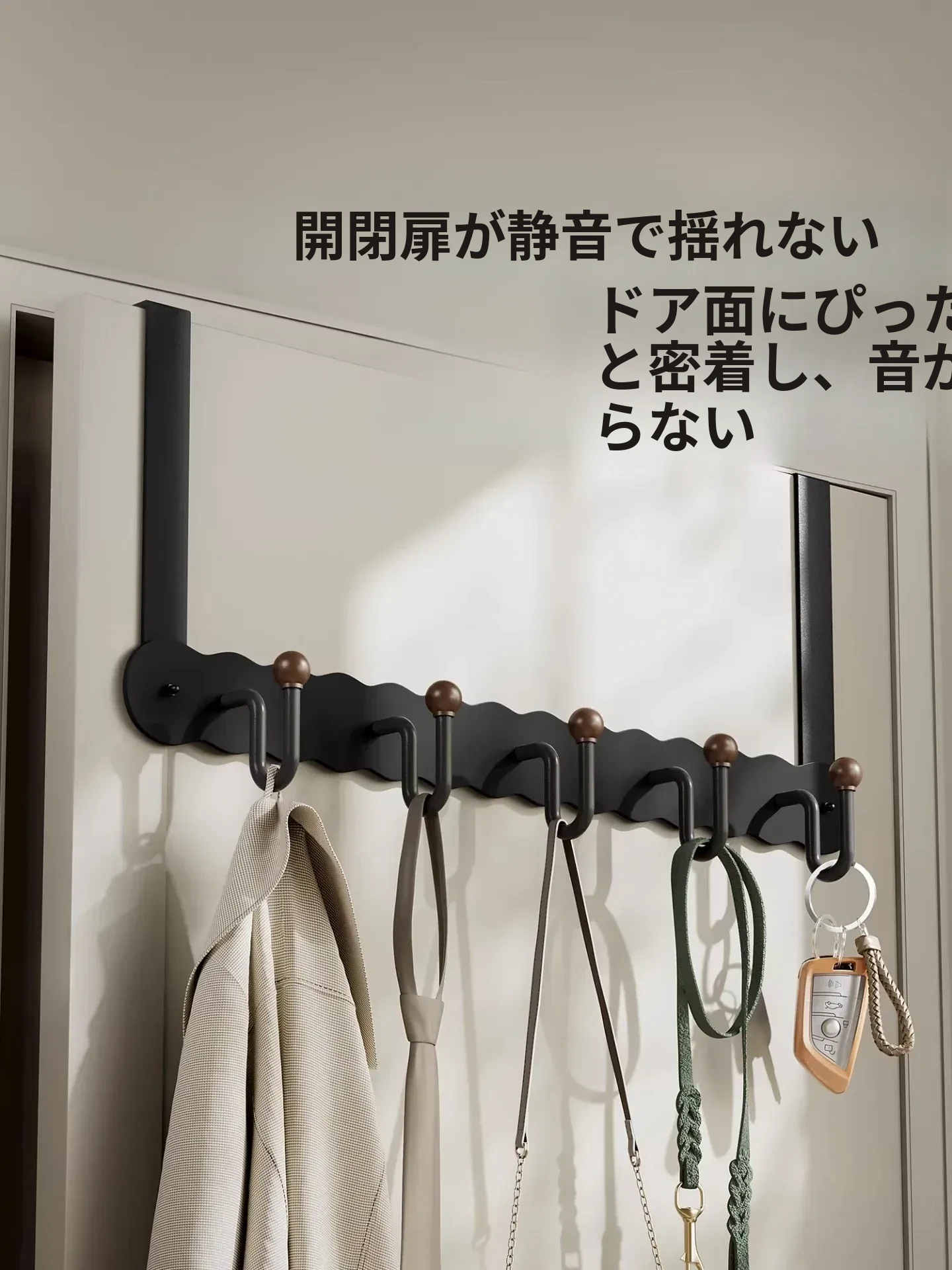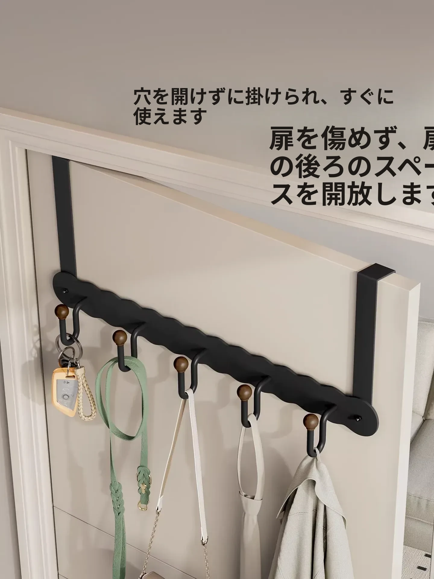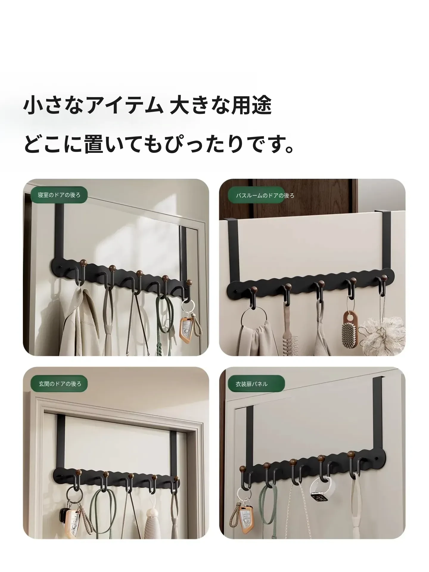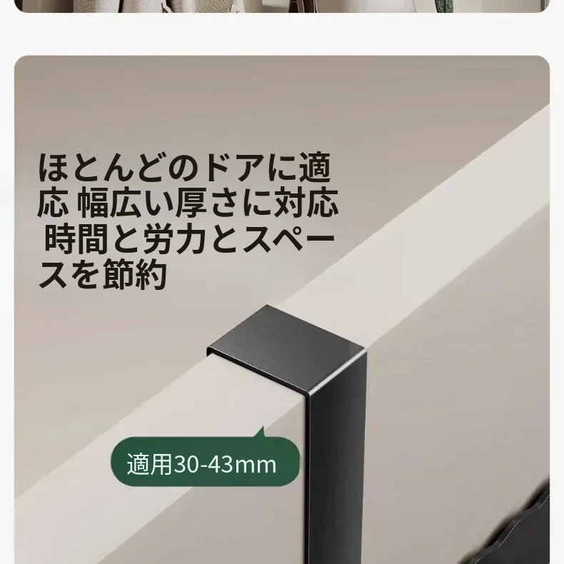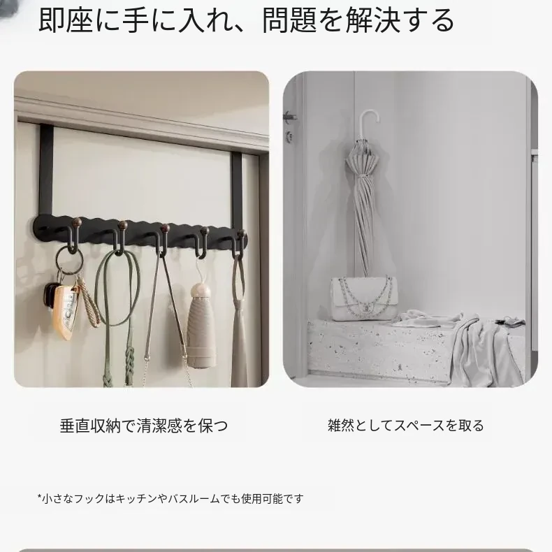 シンプルでスタイリッシュなハンガー!ドアの後ろに簡単に取り付け、衣類やタオルをスマートに収納。穴を開けずに使える玄関やバスルームに最適な衣類掛けです。