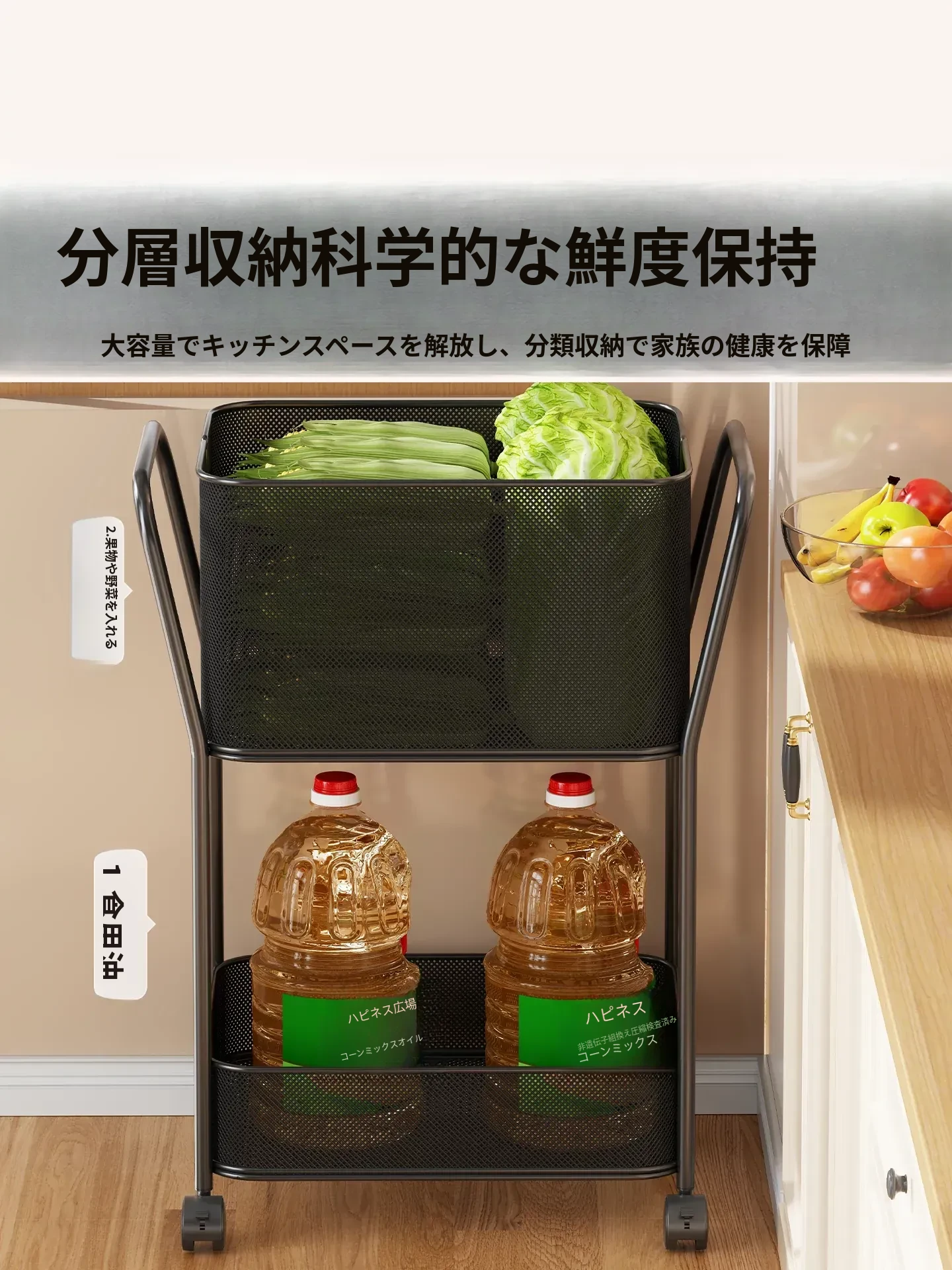 頑丈な果物と野菜の収納ラック!壁にぴったりフィットするコーナー型デザインで、キッチンをスッキリ整理。使いやすいバスケット付きで、フルーツや野菜を美しくディスプレイしながら収納できます。台所をスタイリッシュに彩る必需品!