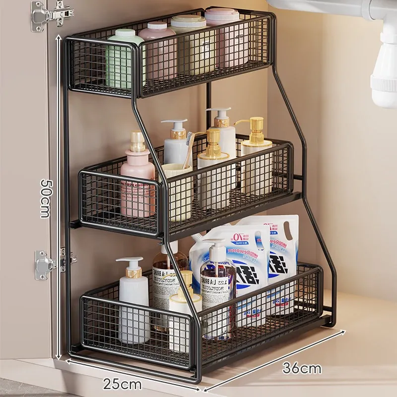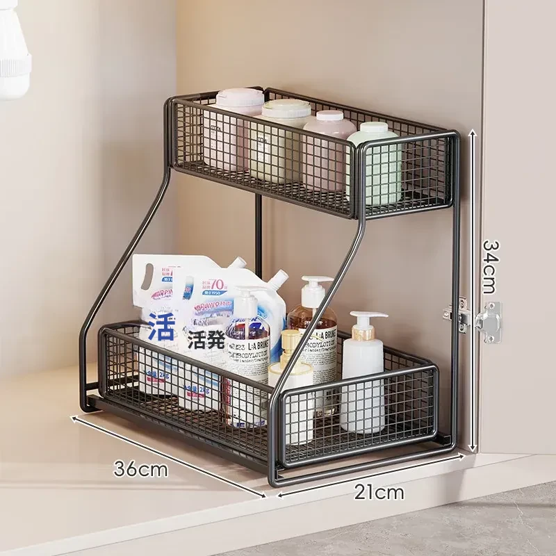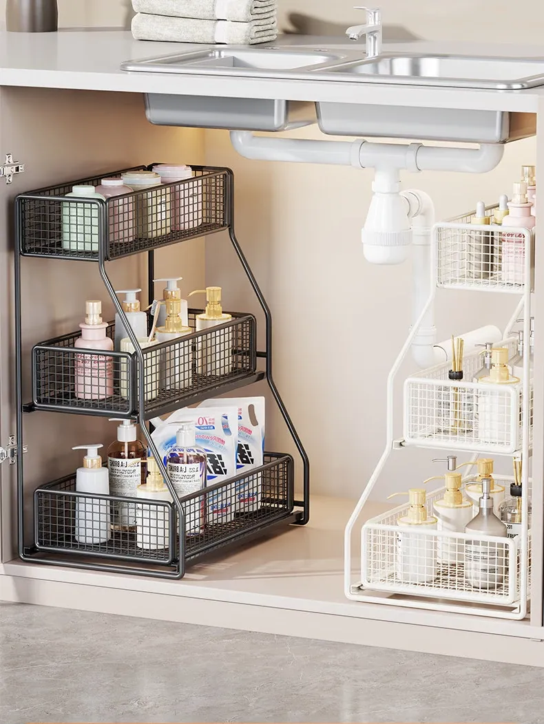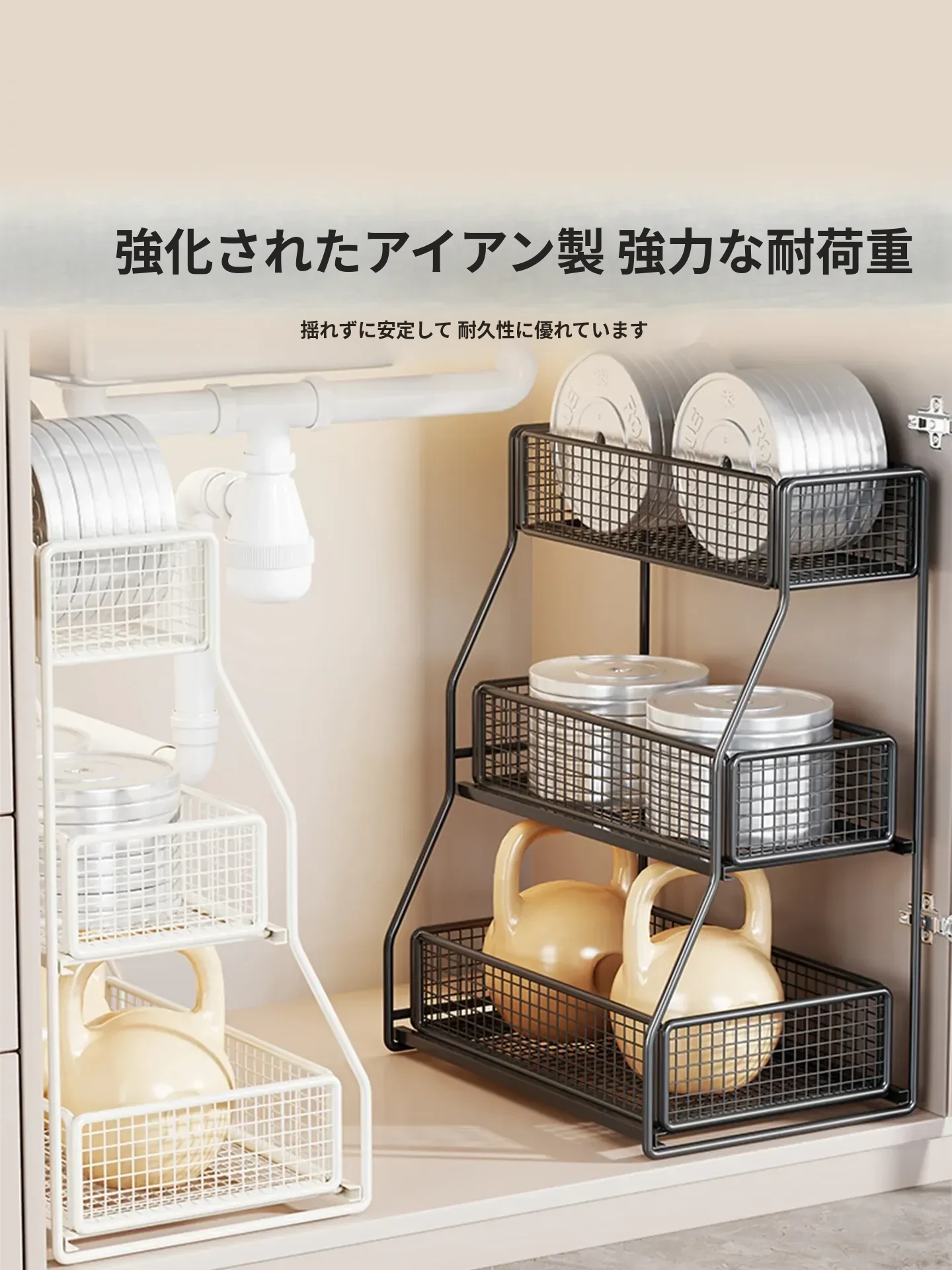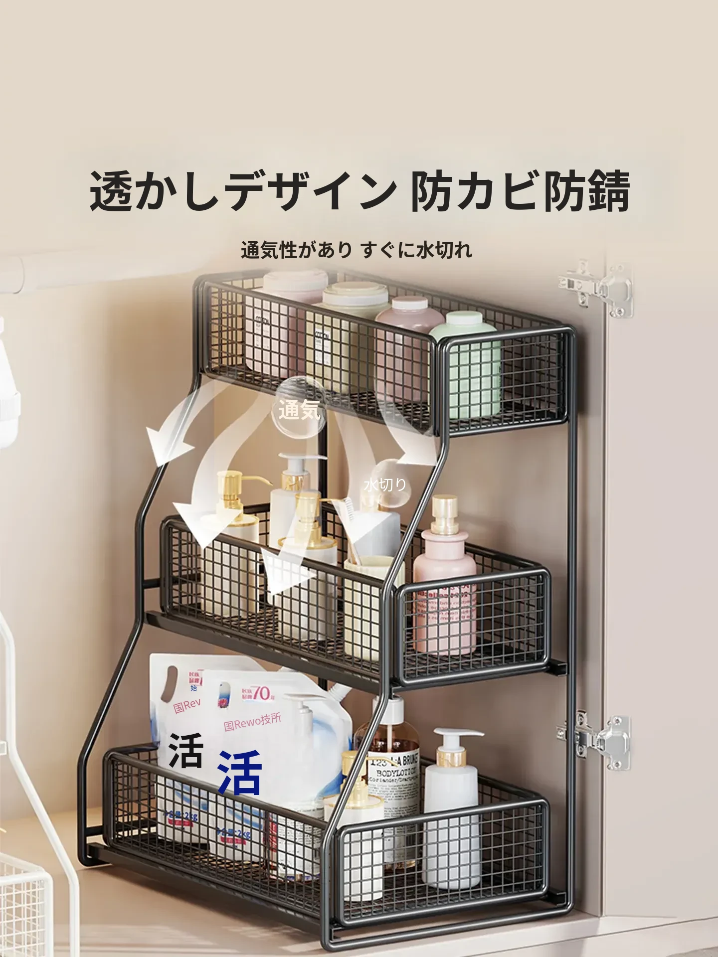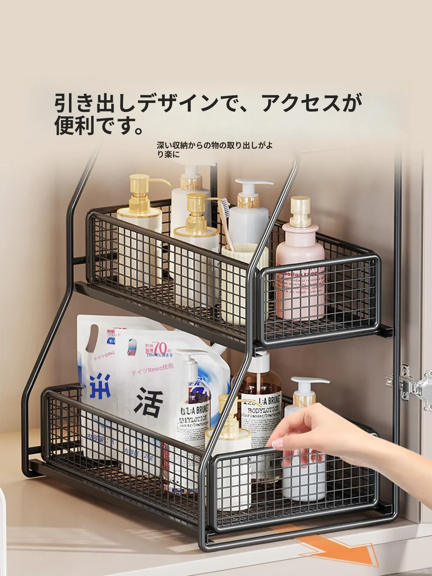 キッチンやバスルームに最適!下水槽用収納ラック - 引き出し式の多層シェルフで、すっきり整理整頓!洗面台下のスペースを有効活用し、使いやすく収納力抜群のアイテムです。