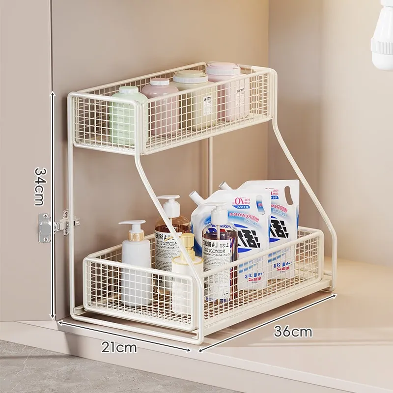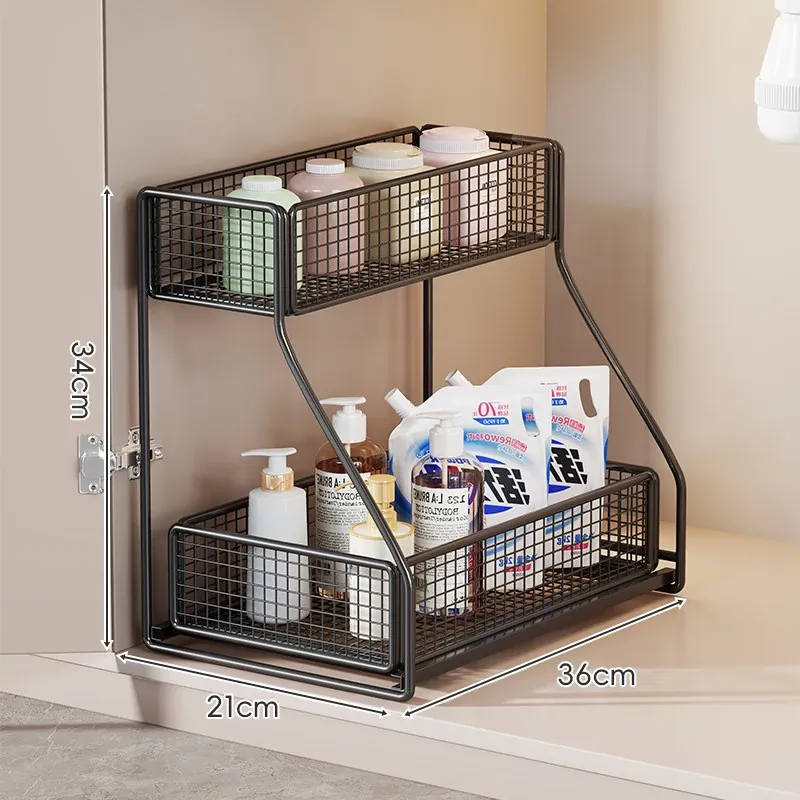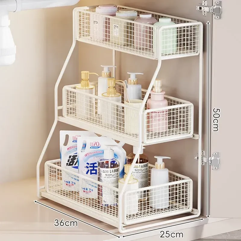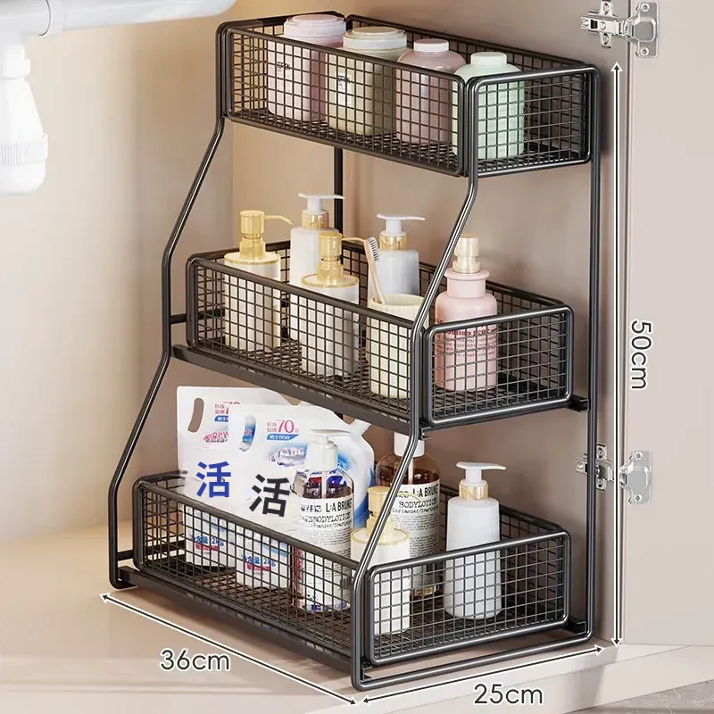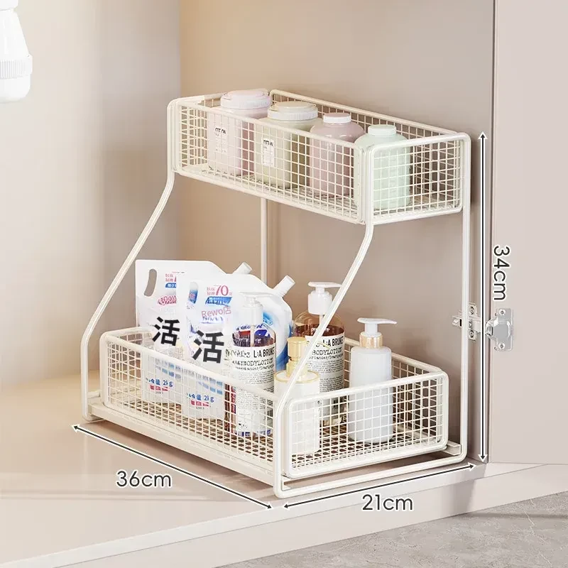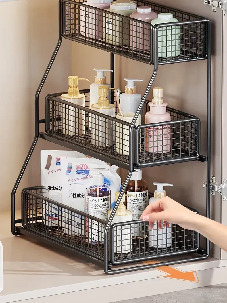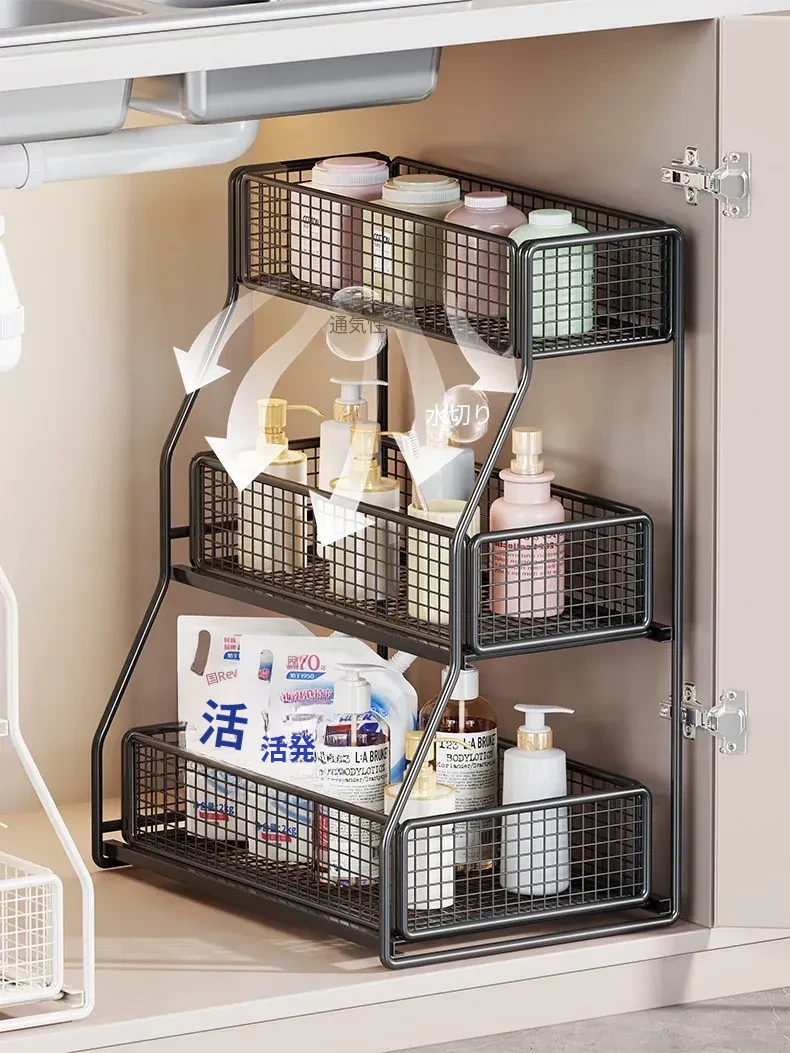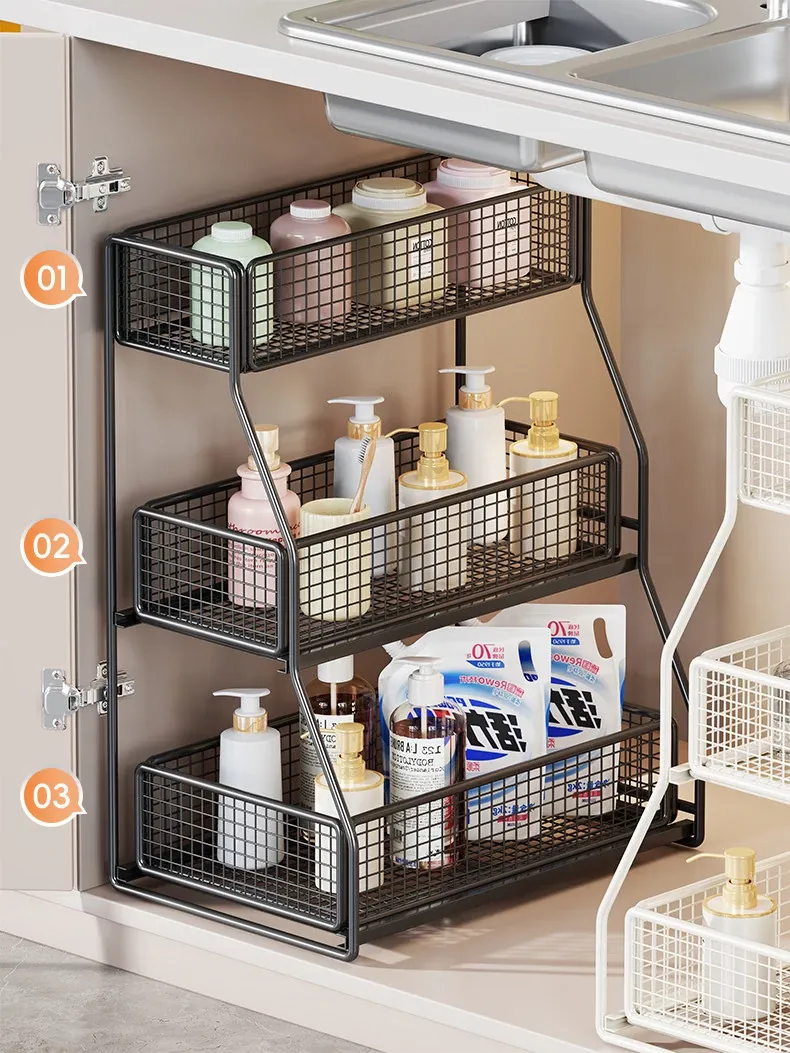 キッチンやバスルームに最適!下水槽用収納ラック - 引き出し式の多層シェルフで、すっきり整理整頓!洗面台下のスペースを有効活用し、使いやすく収納力抜群のアイテムです。