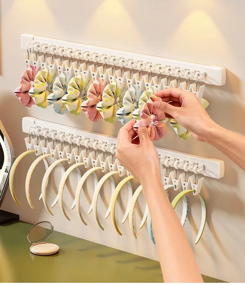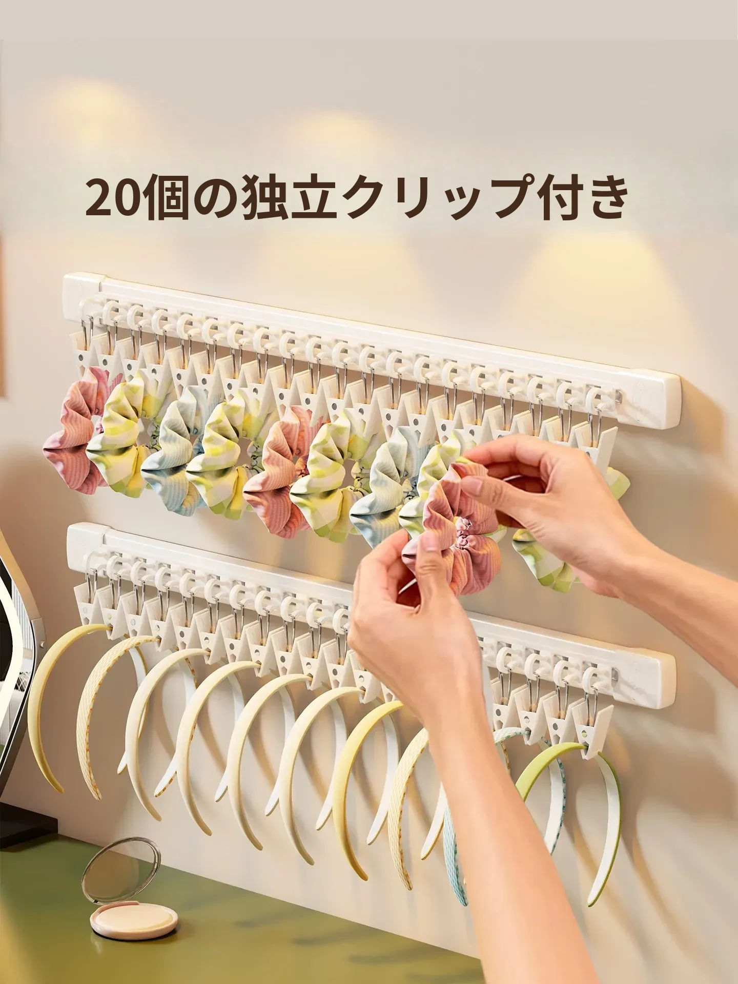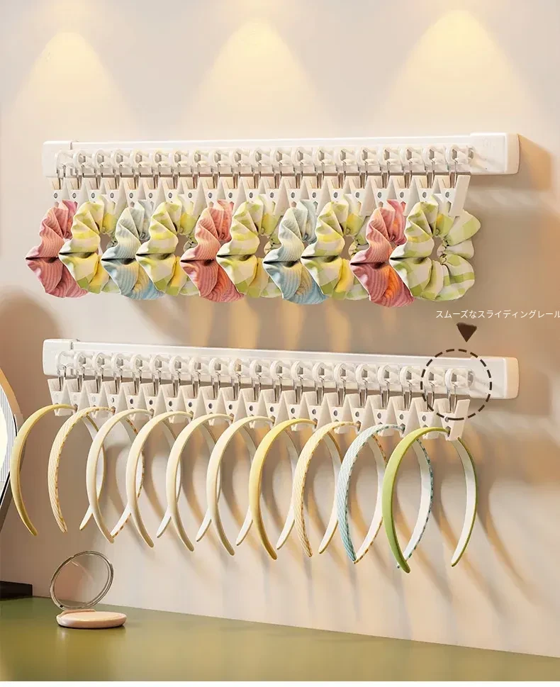 壁掛け式の大腸ヘアゴム収納神器!穴を開けずに取り付けられるスライドレールで、頭飾りやヘアアクセサリーを美しく展示。おしゃれに整理整頓できる便利アイテムです!