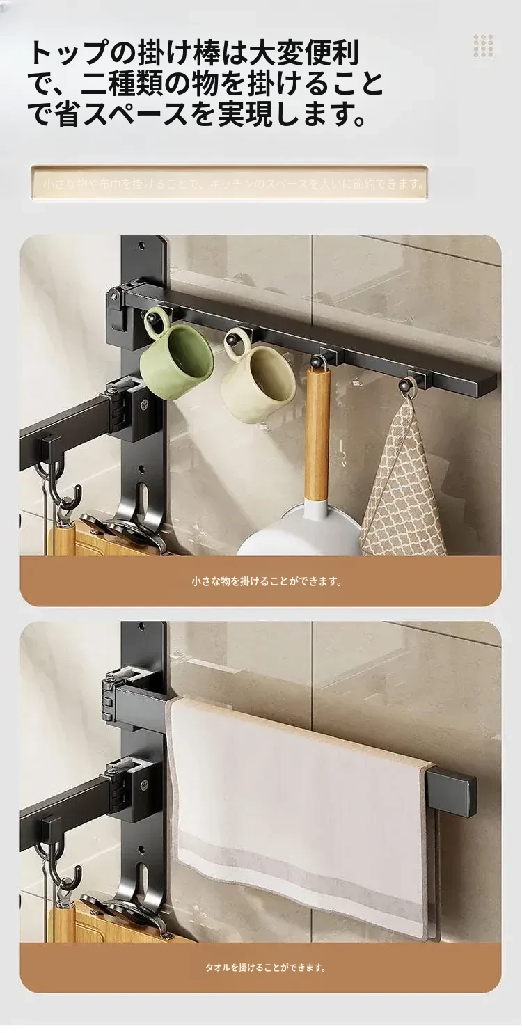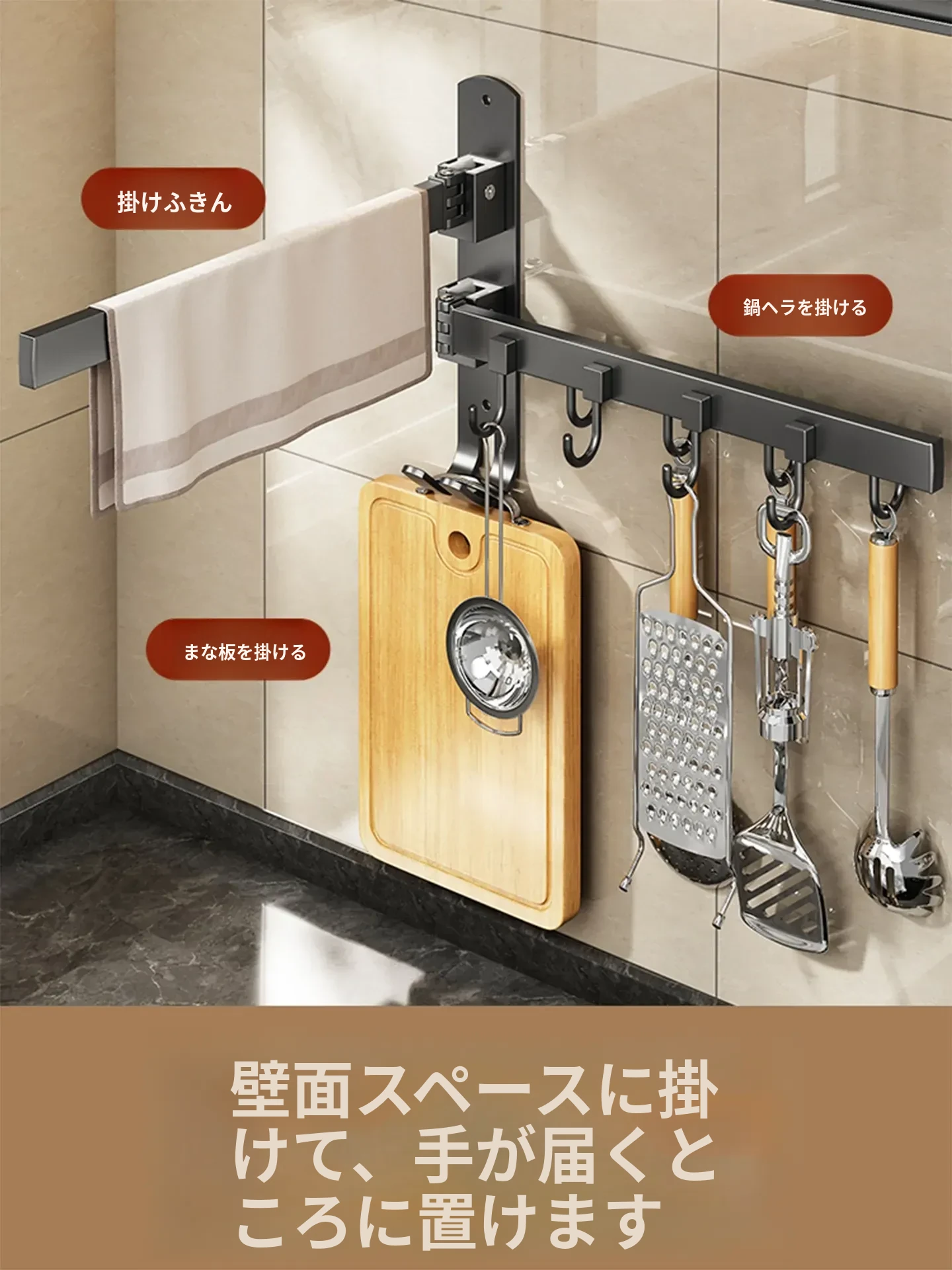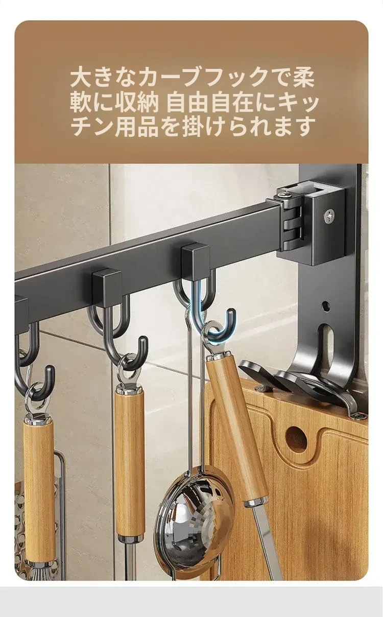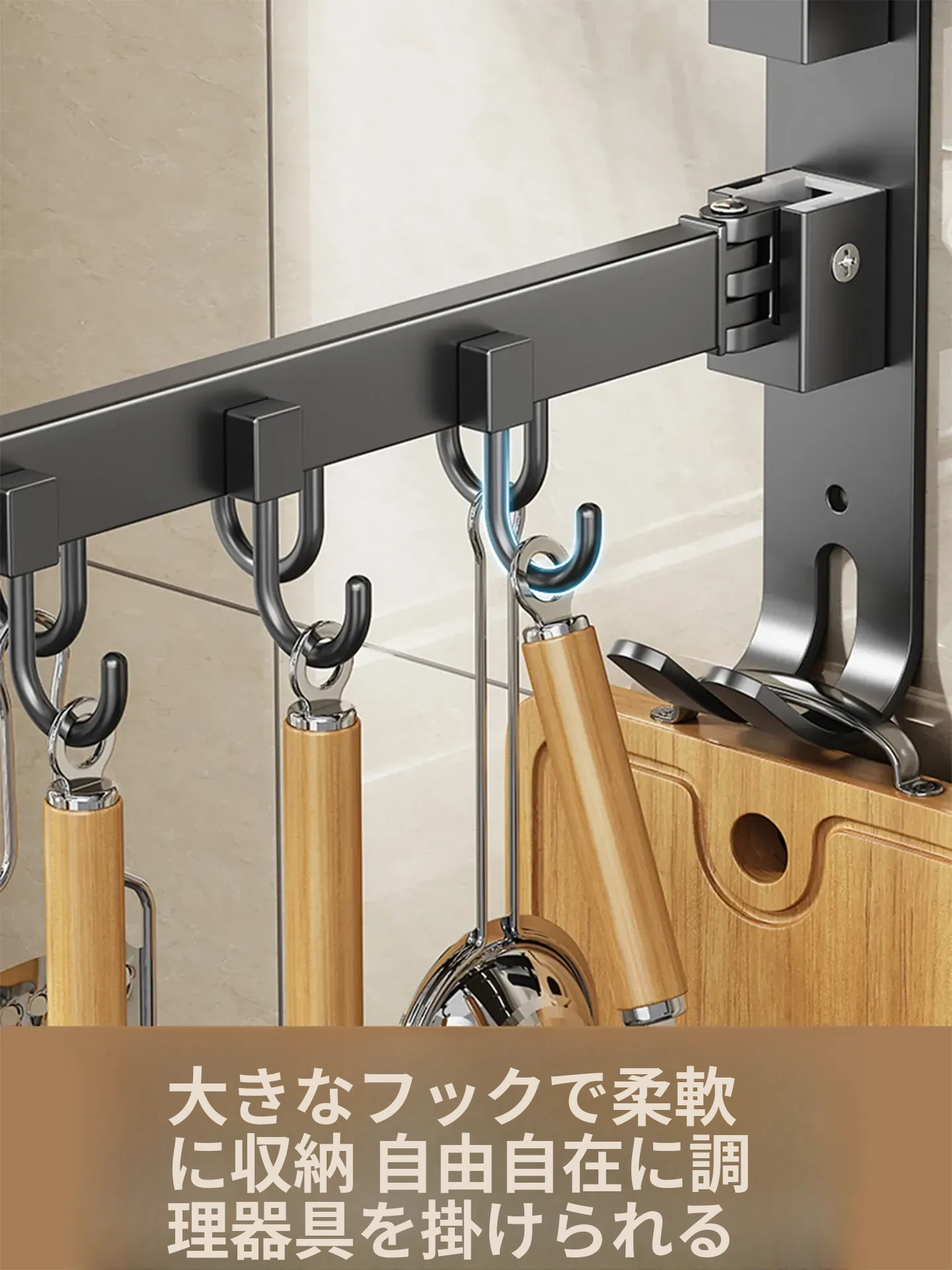 キッチン用フック収納ラック - 壁掛け式の便利なフックで、鍋、ヘラ、スプーンをスッキリ収納!穴を開けずに簡単取り付け、鍋蓋や包丁も整理できるスマートなアイデア商品です。