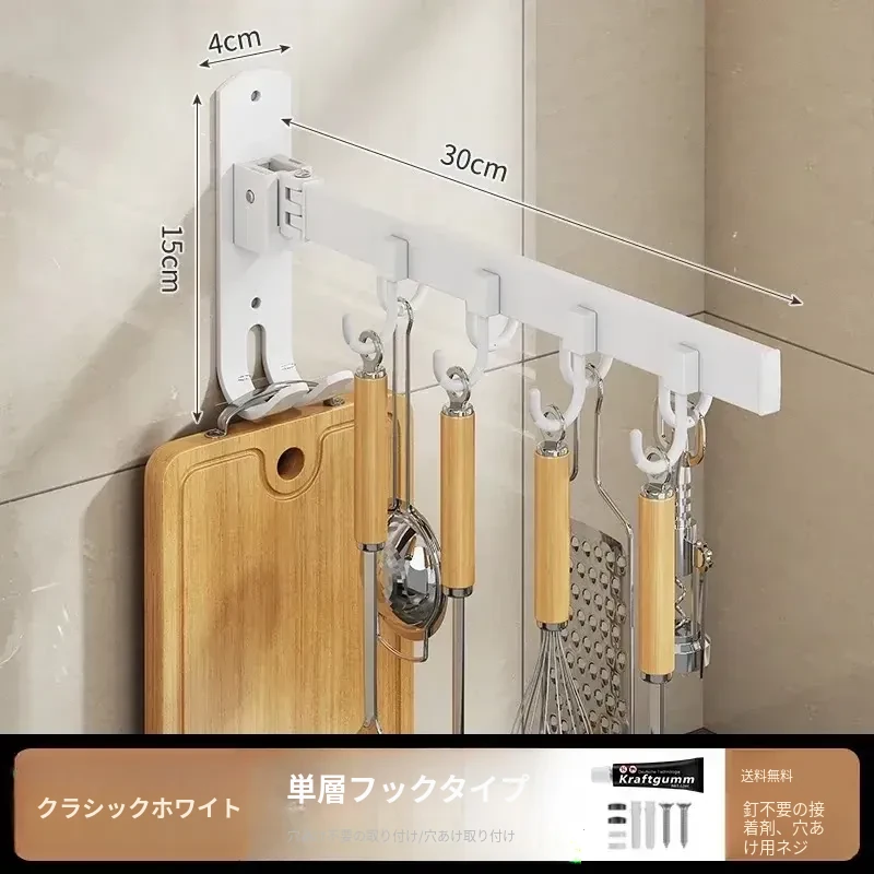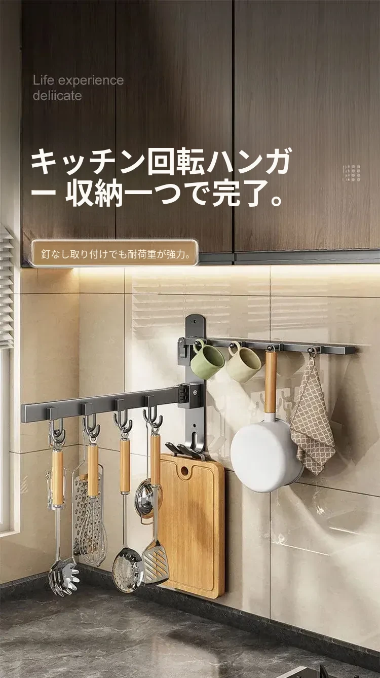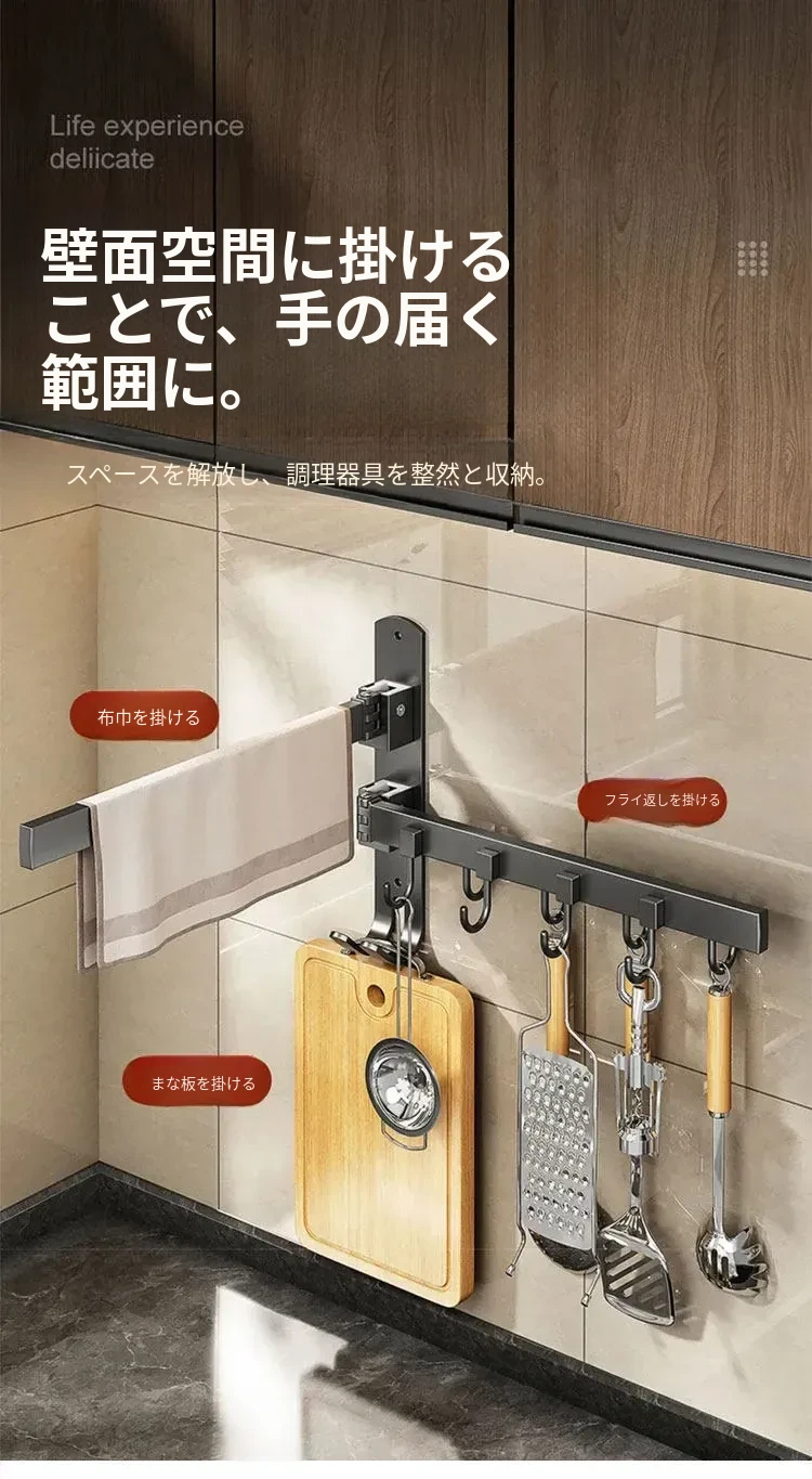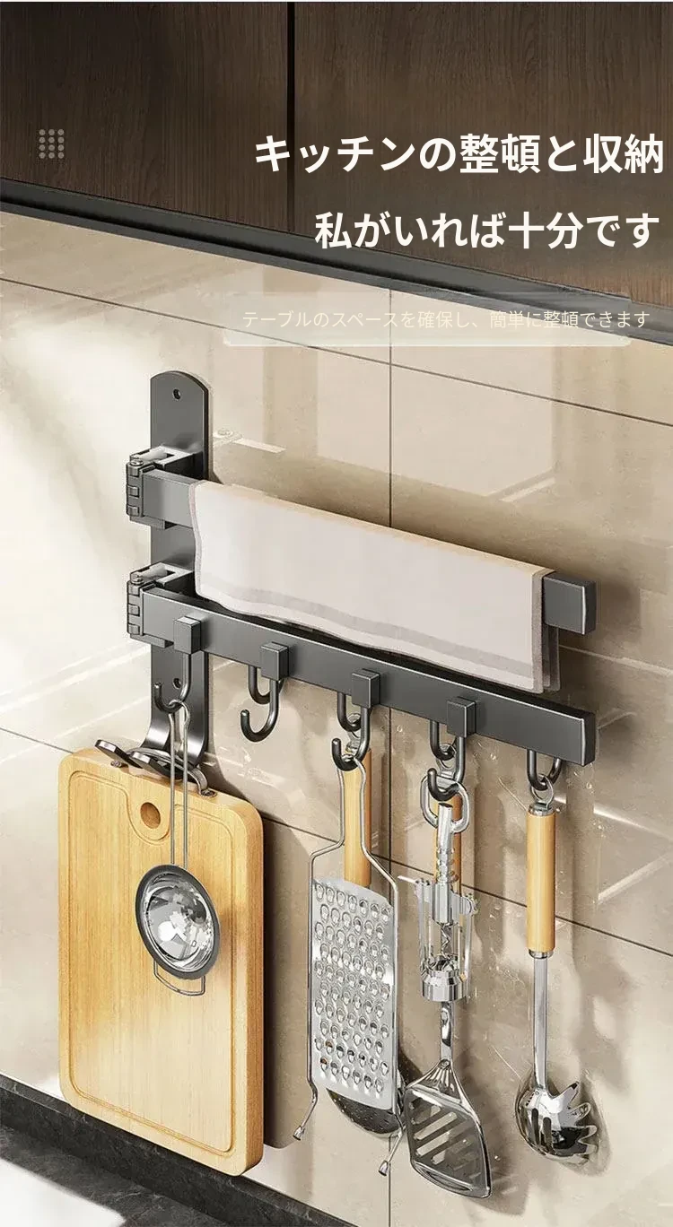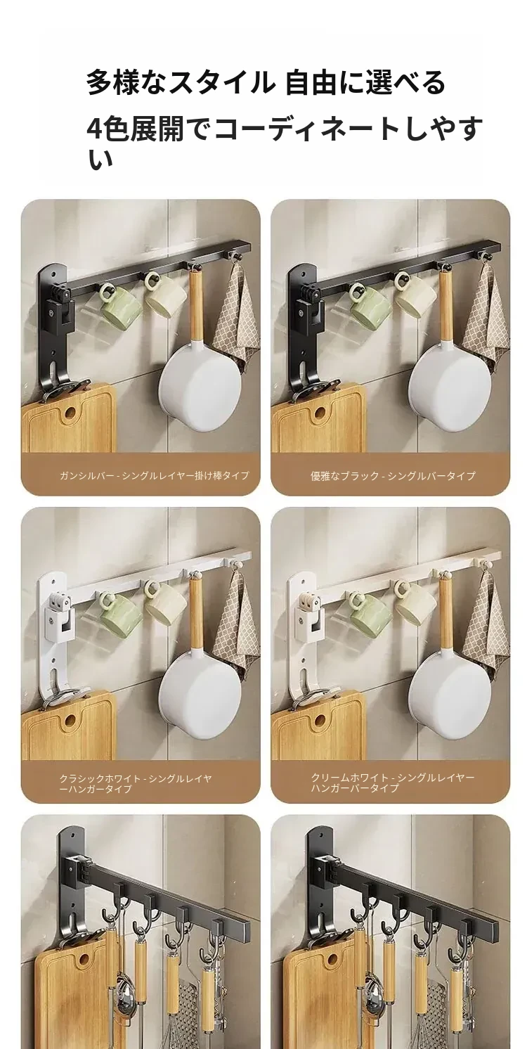 キッチン用フック収納ラック - 壁掛け式の便利なフックで、鍋、ヘラ、スプーンをスッキリ収納!穴を開けずに簡単取り付け、鍋蓋や包丁も整理できるスマートなアイデア商品です。