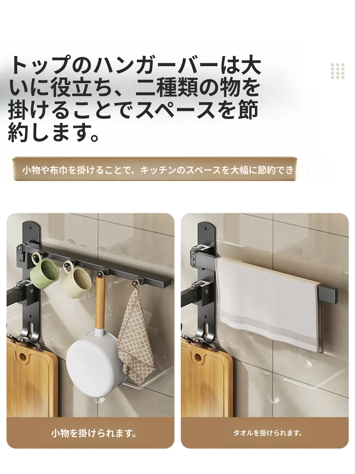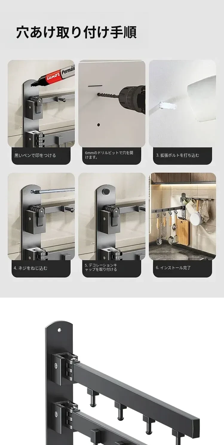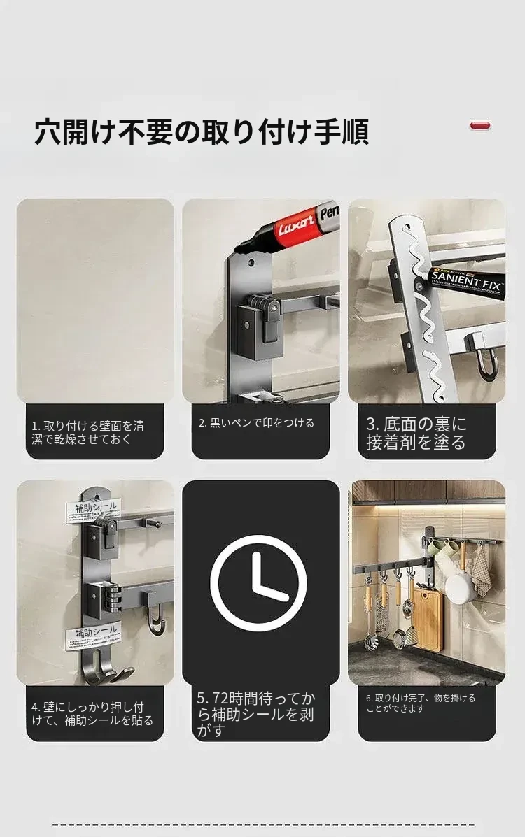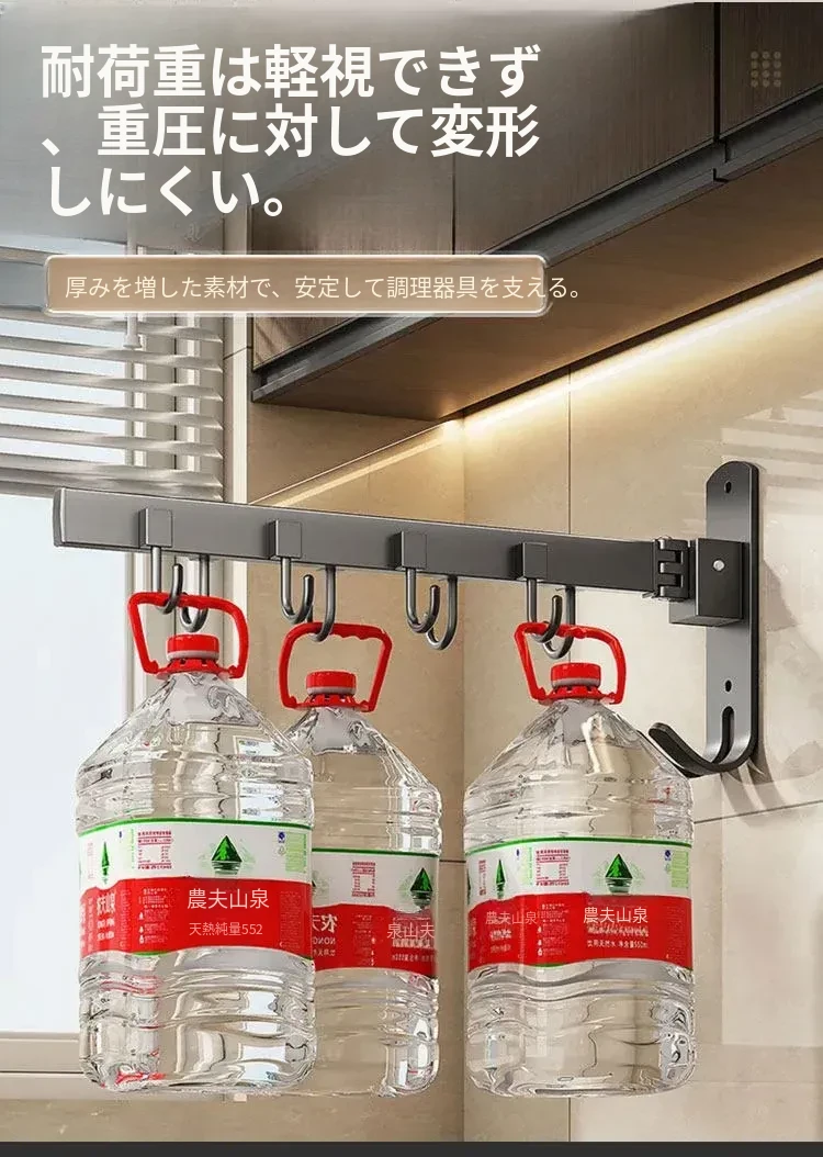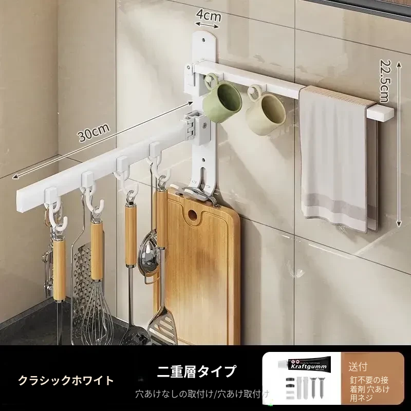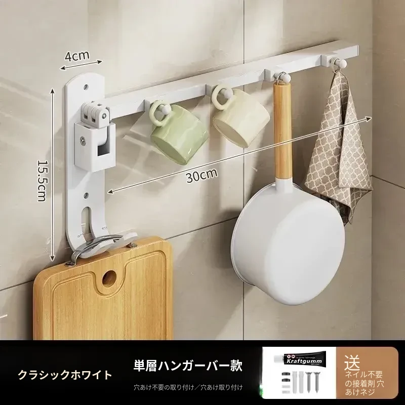 キッチン用フック収納ラック - 壁掛け式の便利なフックで、鍋、ヘラ、スプーンをスッキリ収納!穴を開けずに簡単取り付け、鍋蓋や包丁も整理できるスマートなアイデア商品です。
