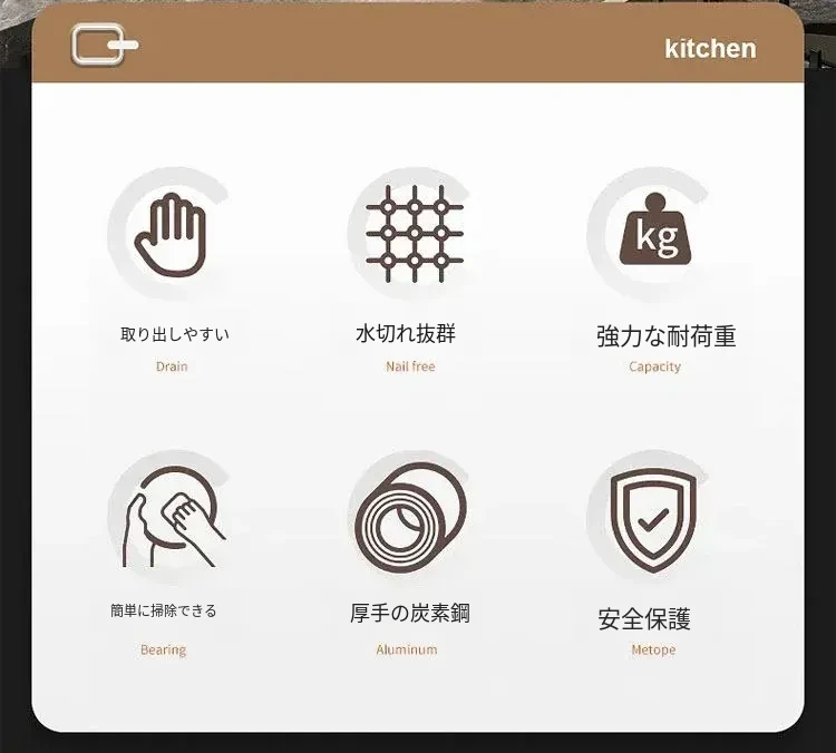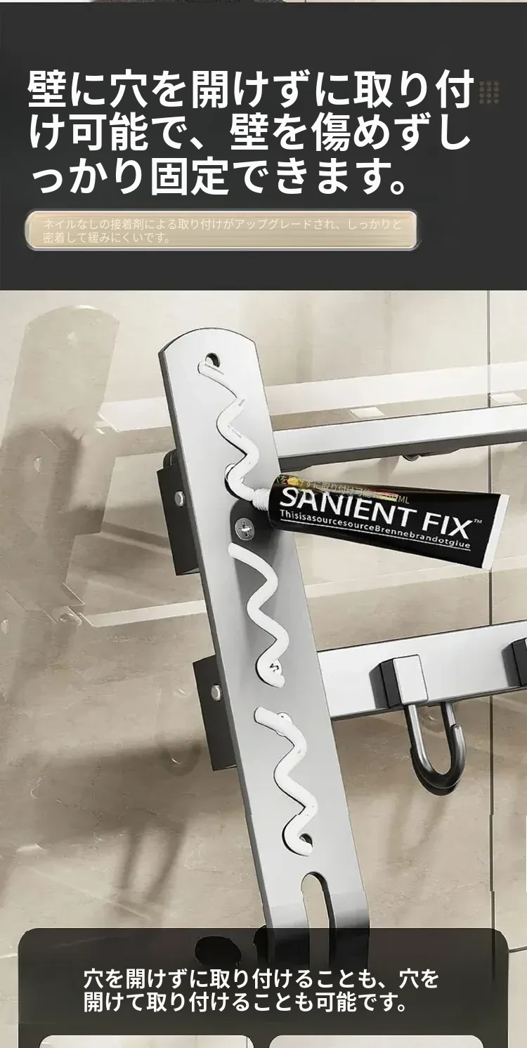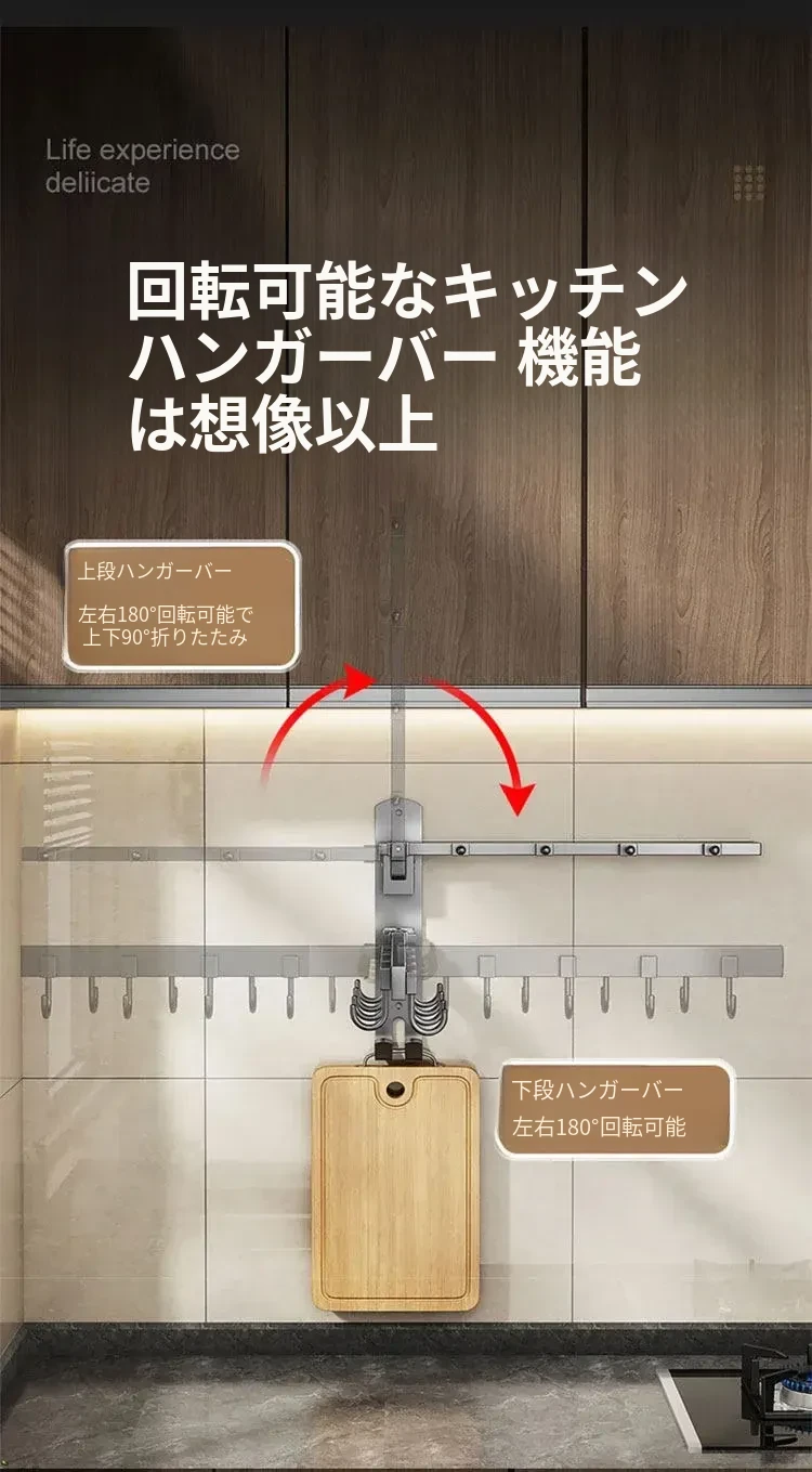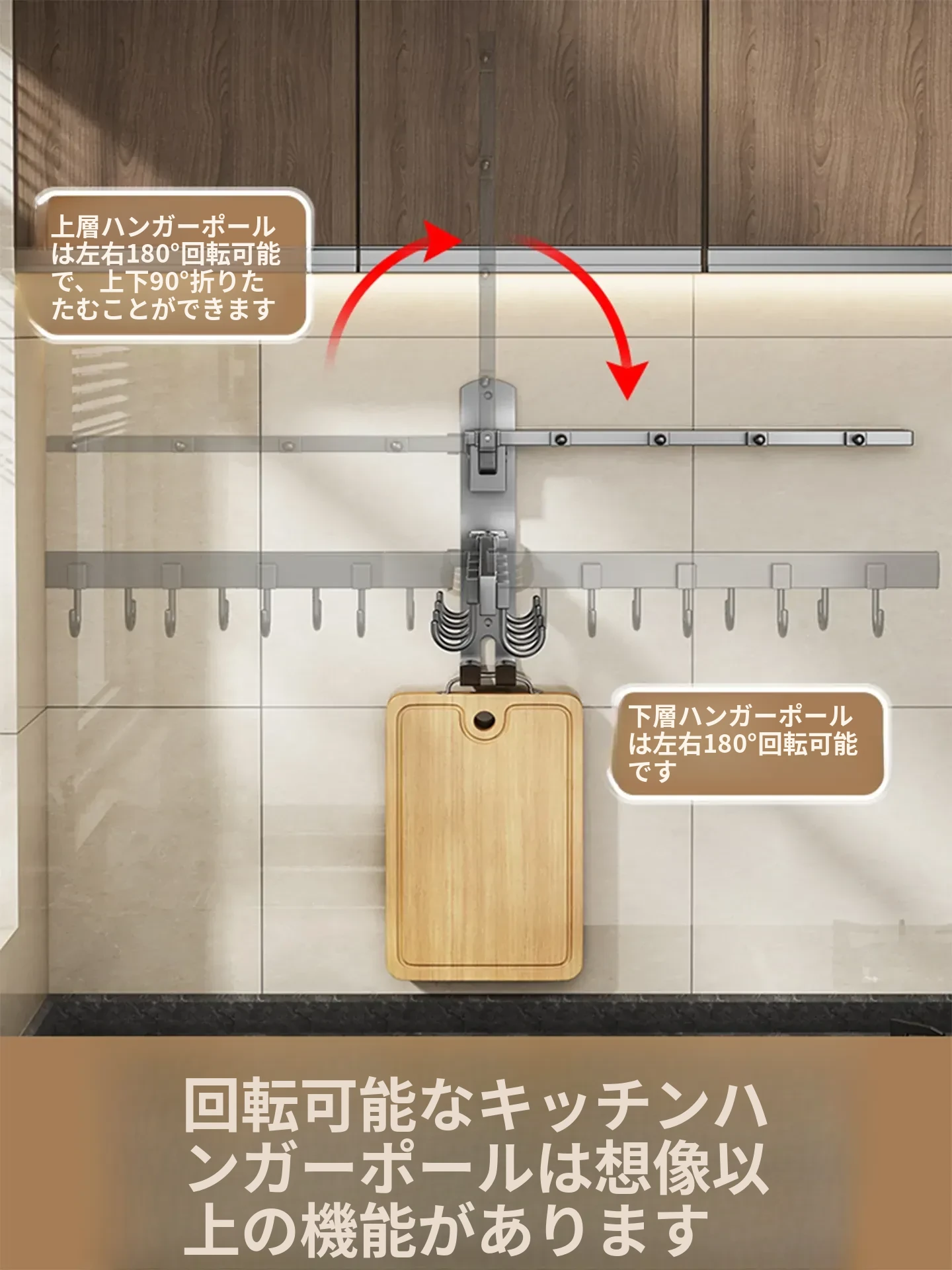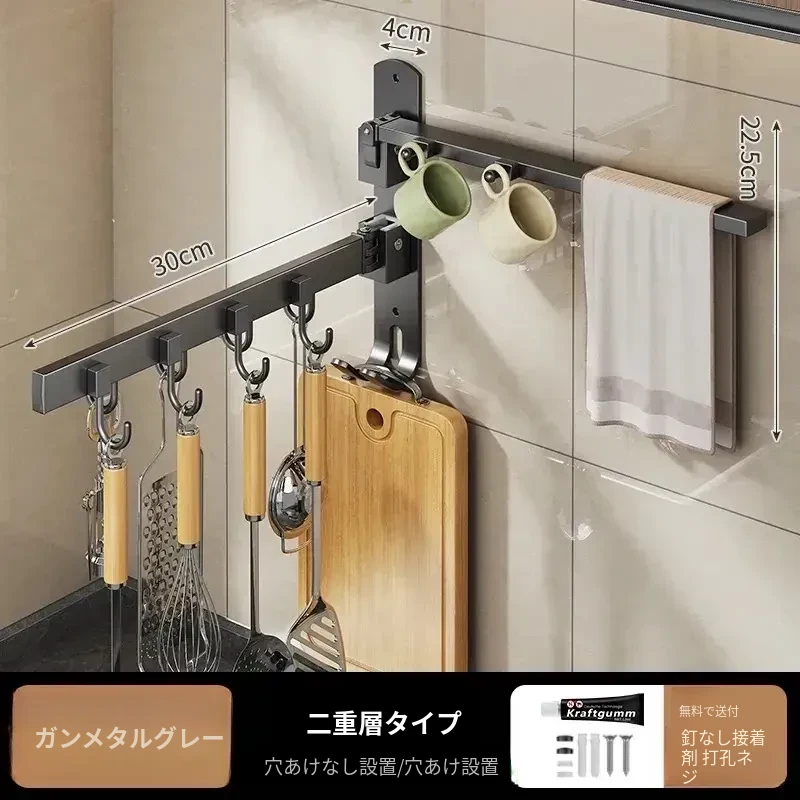 キッチン用フック収納ラック - 壁掛け式の便利なフックで、鍋、ヘラ、スプーンをスッキリ収納!穴を開けずに簡単取り付け、鍋蓋や包丁も整理できるスマートなアイデア商品です。
