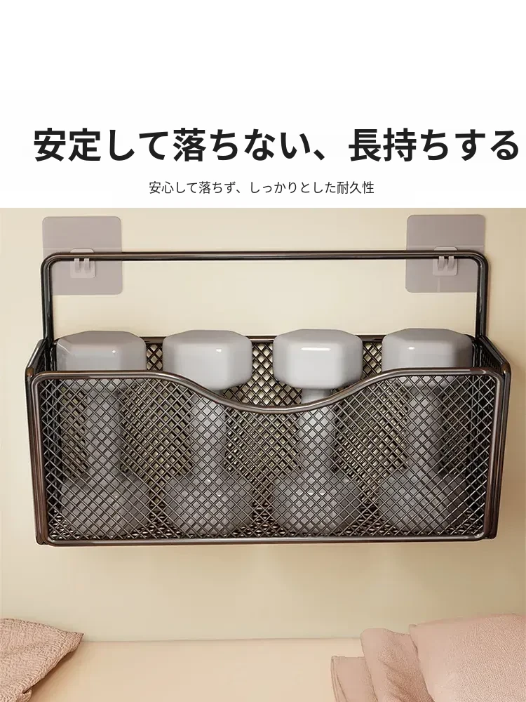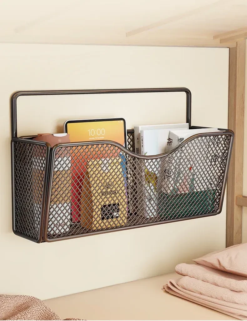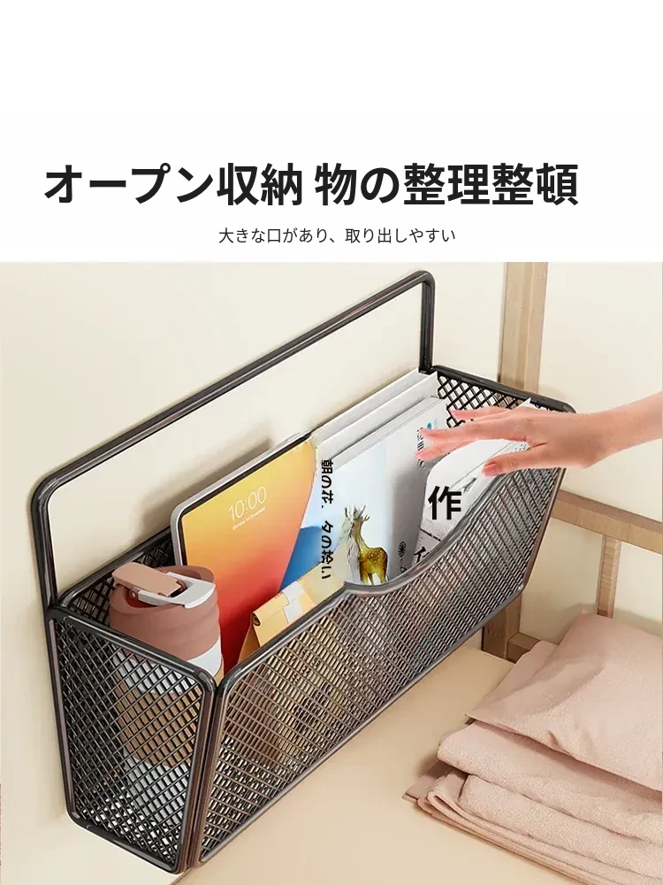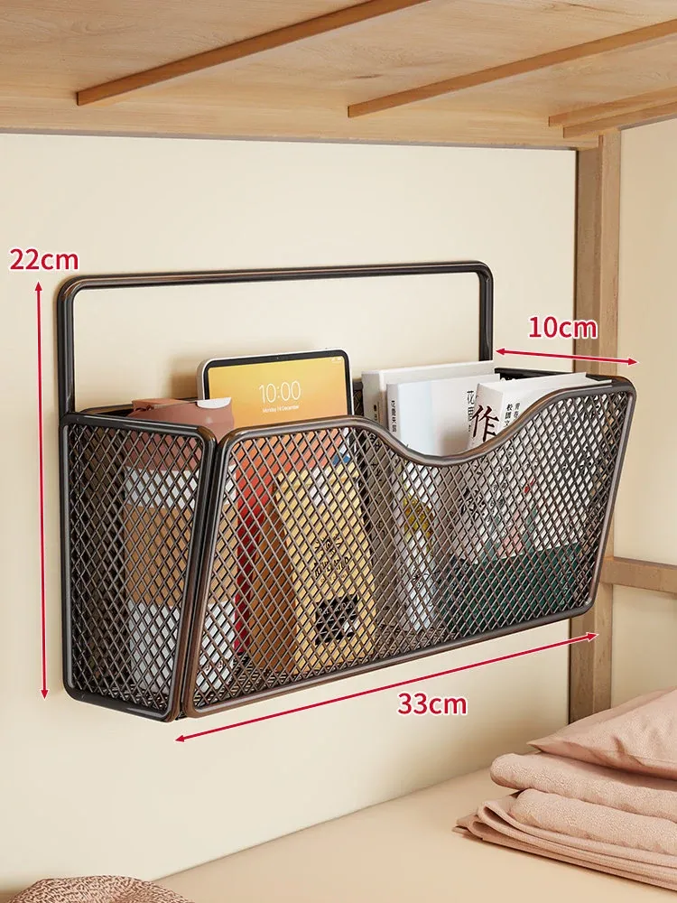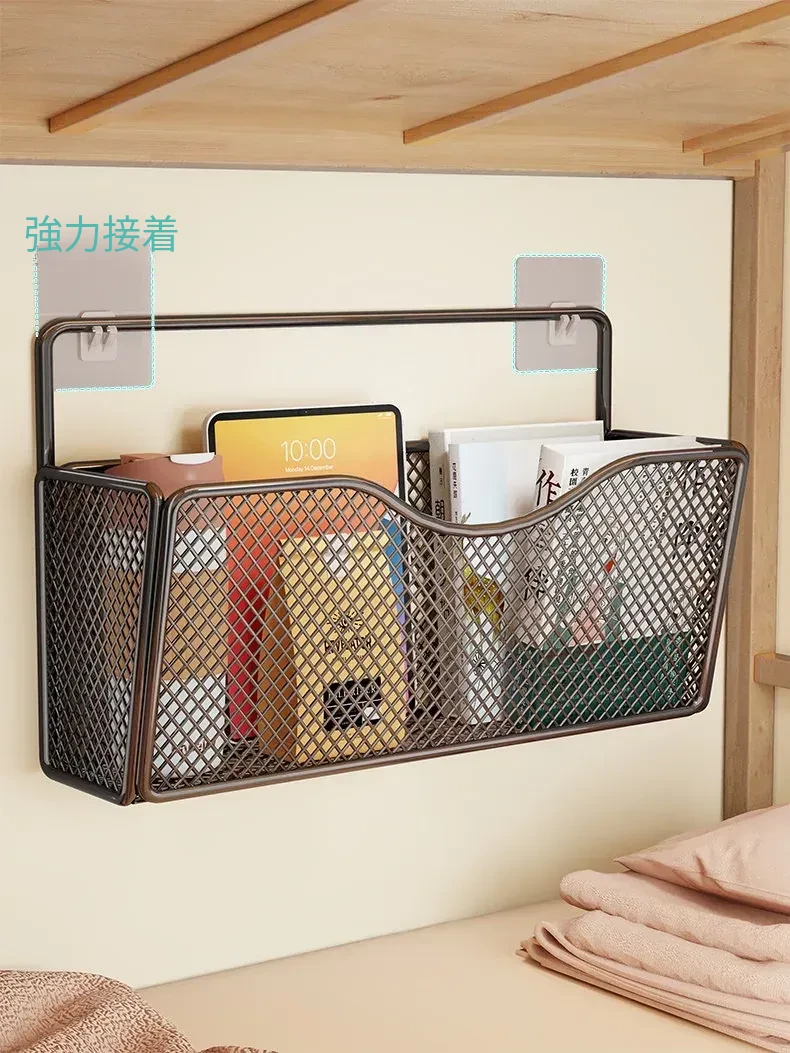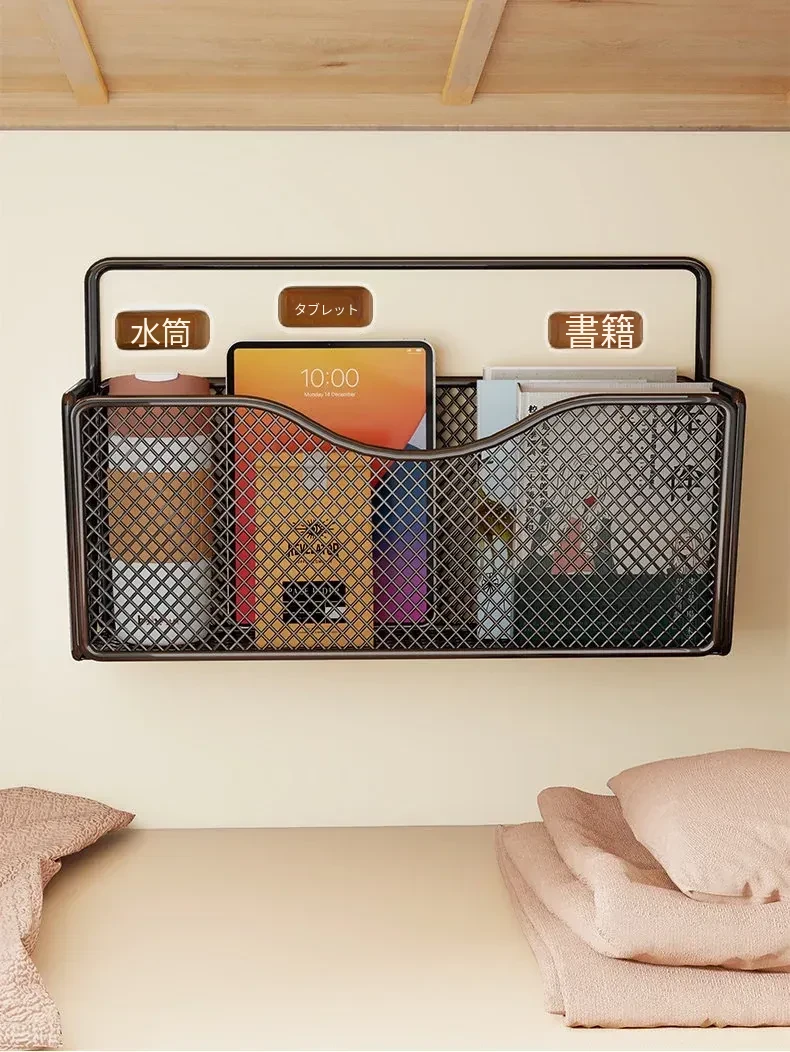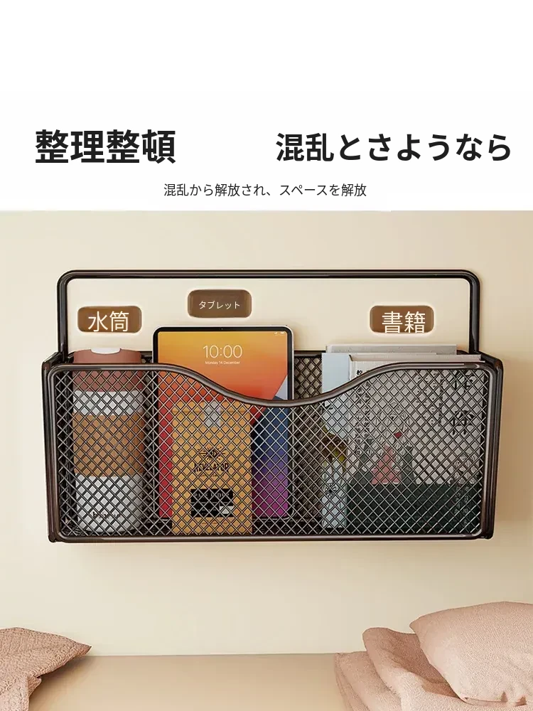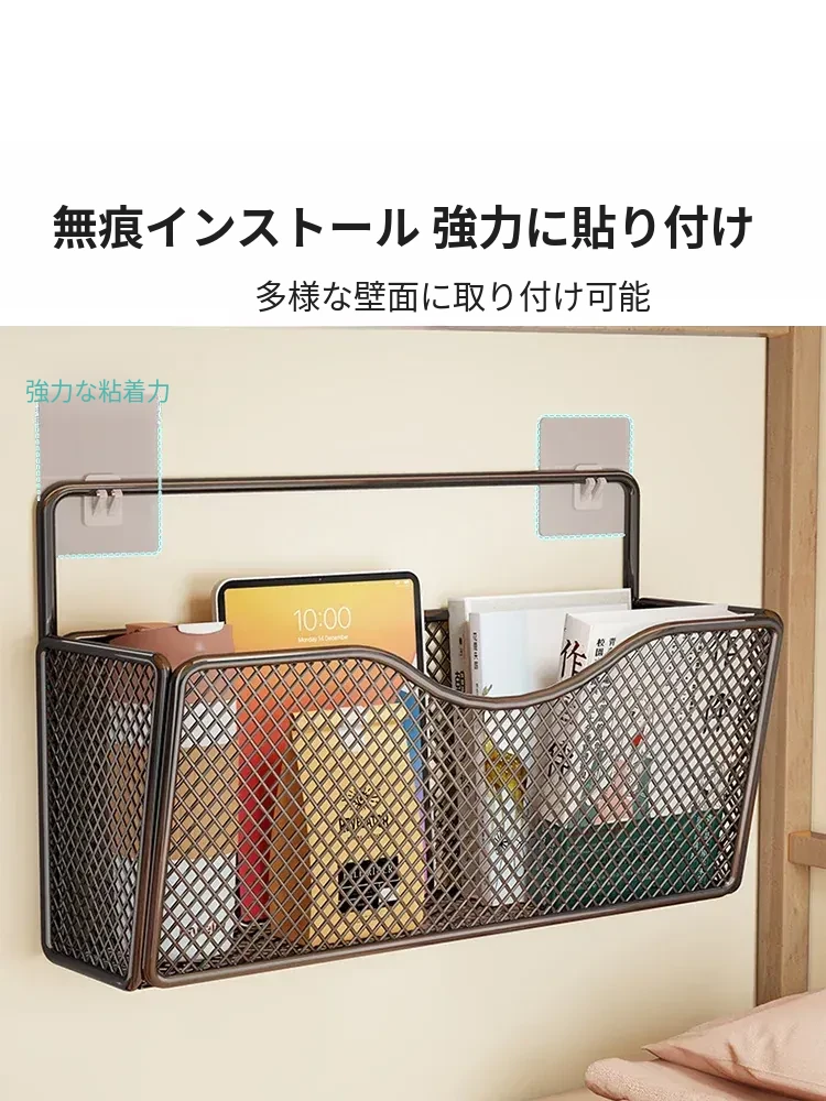 壁掛け収納バスケット - 寝室や宿舎に最適!ベッドサイドや壁面に簡単取り付け、穴あけ不要でスペースを有効活用!おしゃれで便利な収納ソリューション。