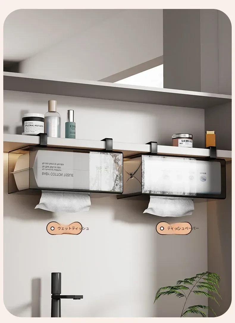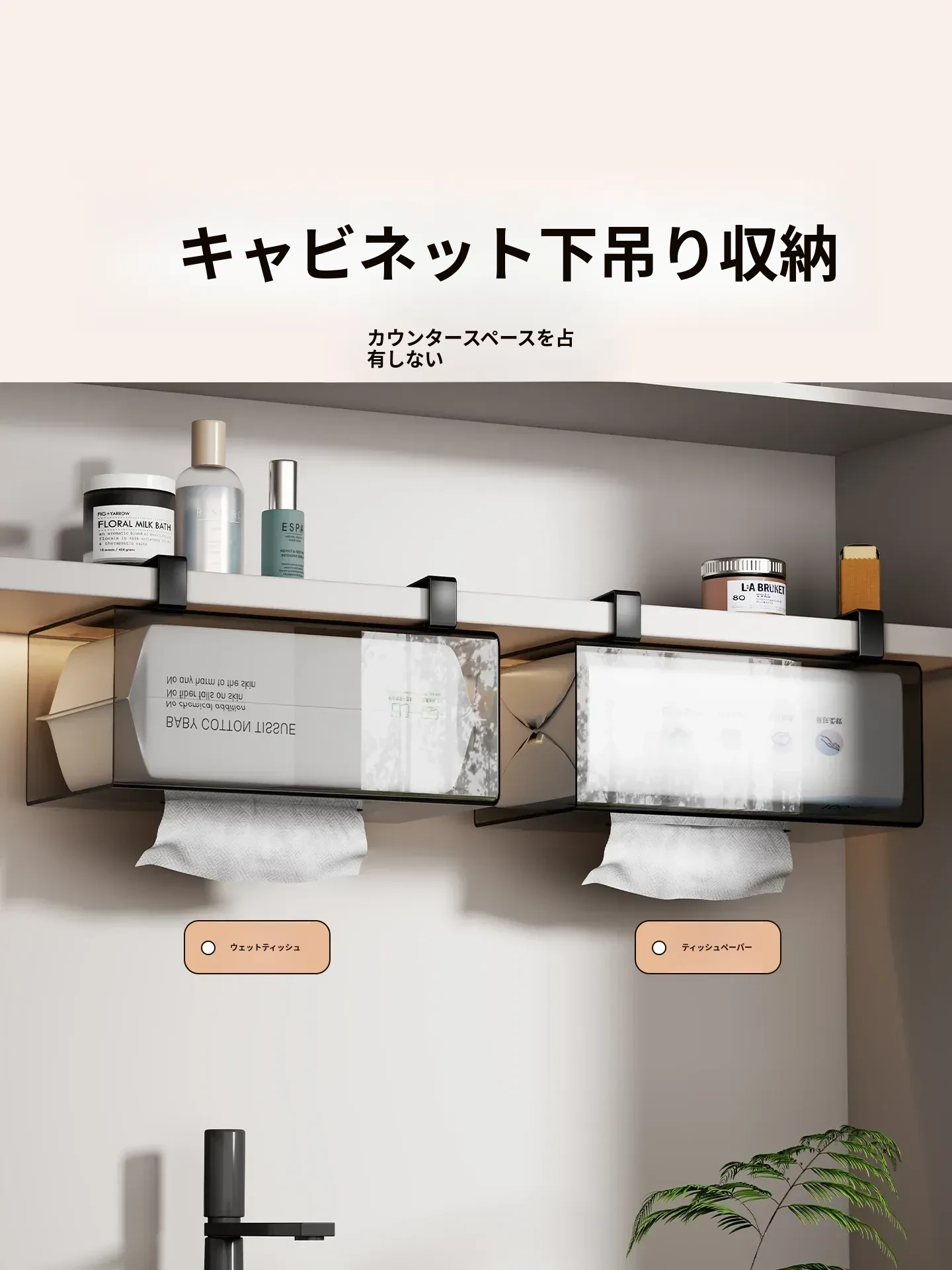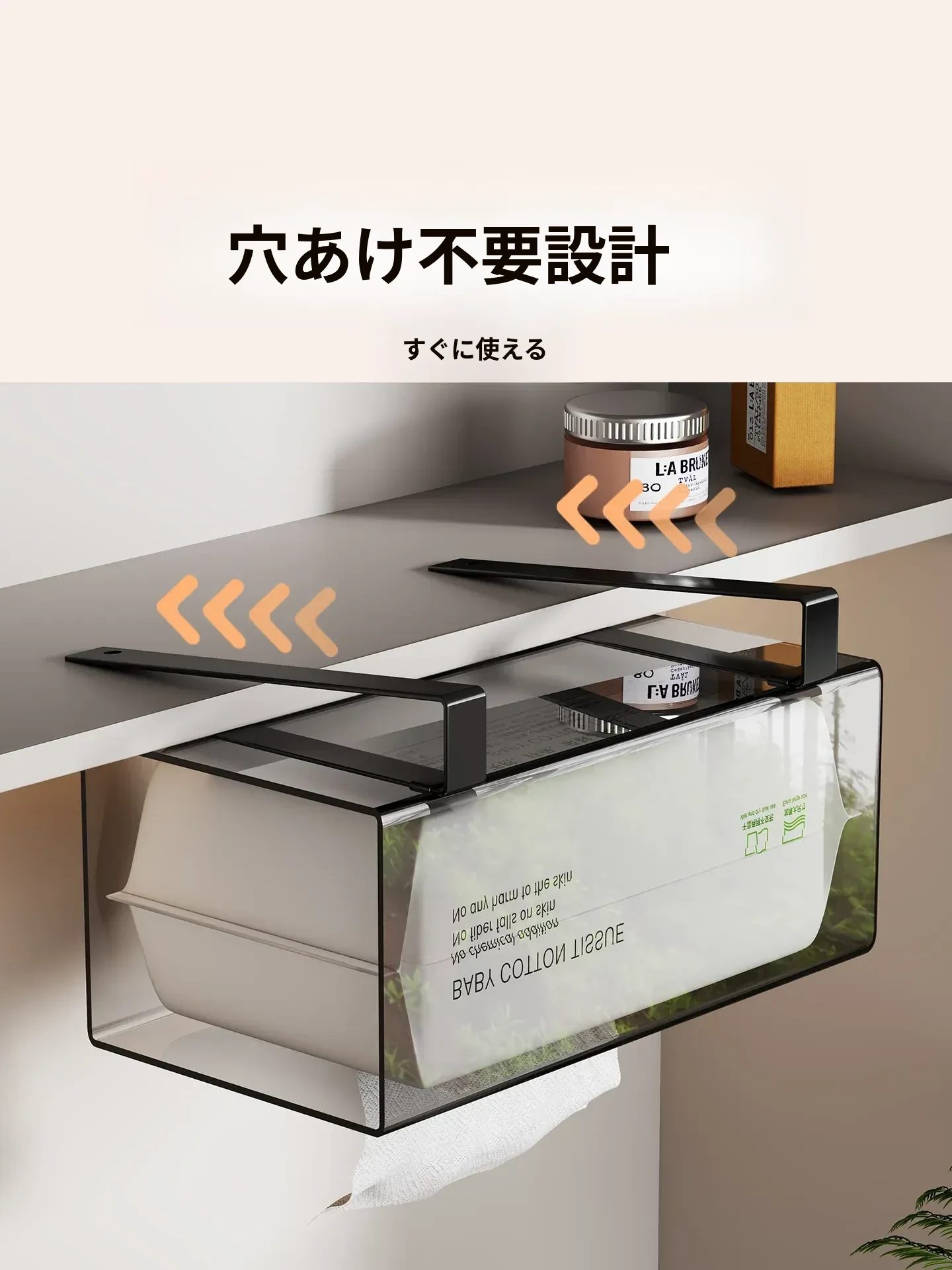 キッチン・バスルーム用壁掛けティッシュホルダー!便利なノー・ドリル設計で、洗面台下や吊り戸棚にスッキリ収納。清潔感溢れるデザインで、使いやすさ抜群!あなたの生活空間をもっと快適に!