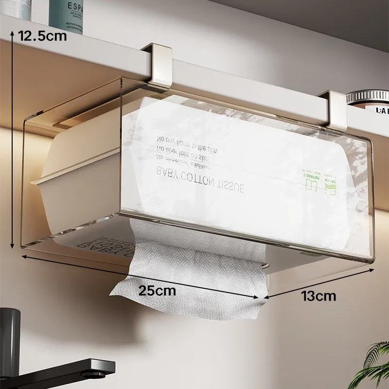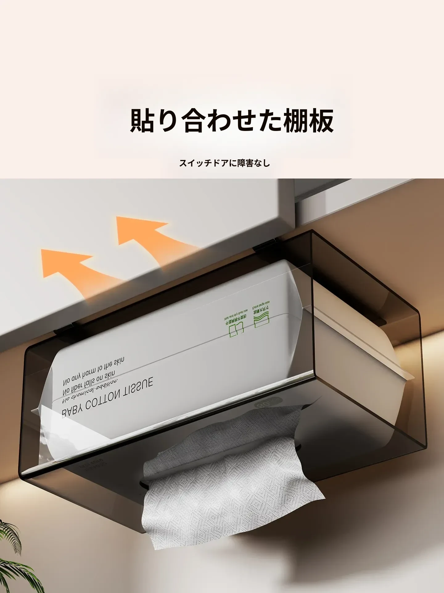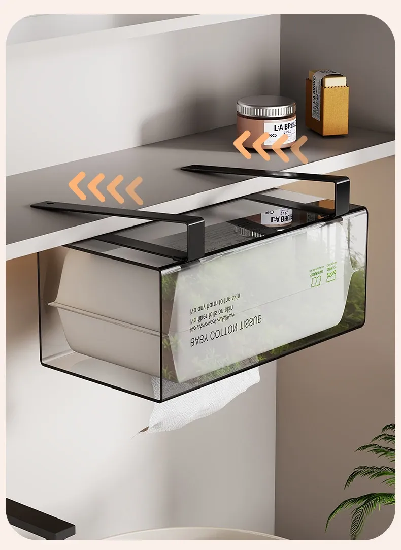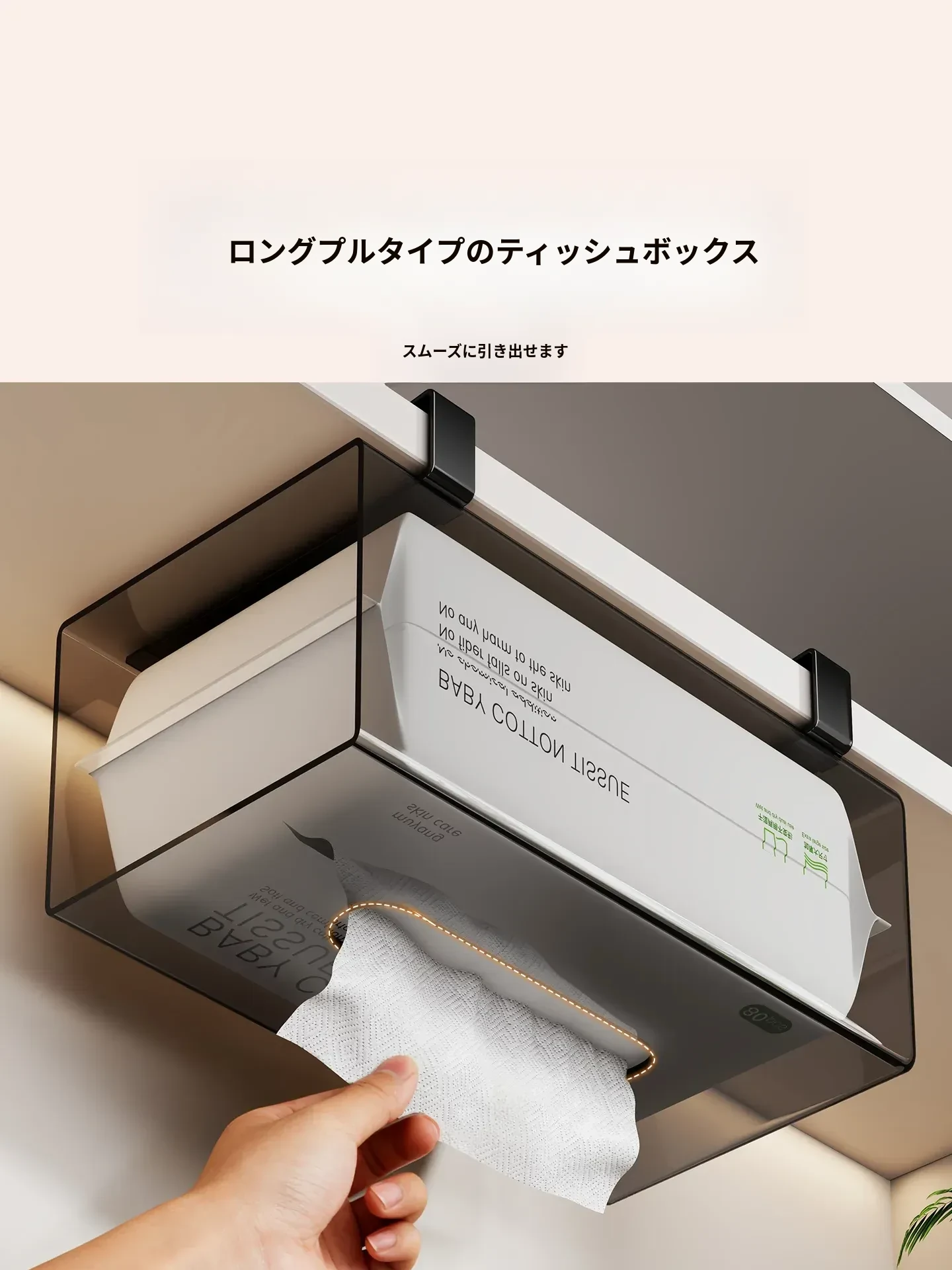 キッチン・バスルーム用壁掛けティッシュホルダー!便利なノー・ドリル設計で、洗面台下や吊り戸棚にスッキリ収納。清潔感溢れるデザインで、使いやすさ抜群!あなたの生活空間をもっと快適に!