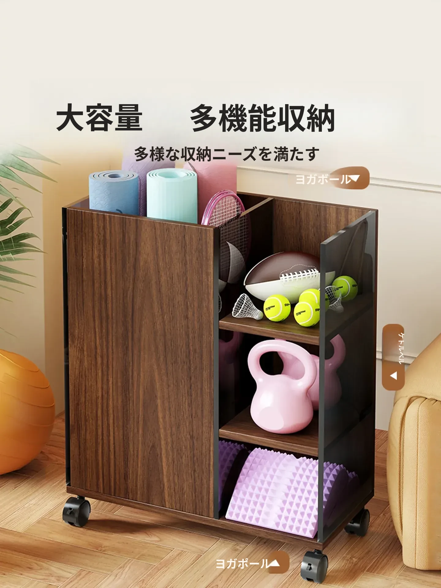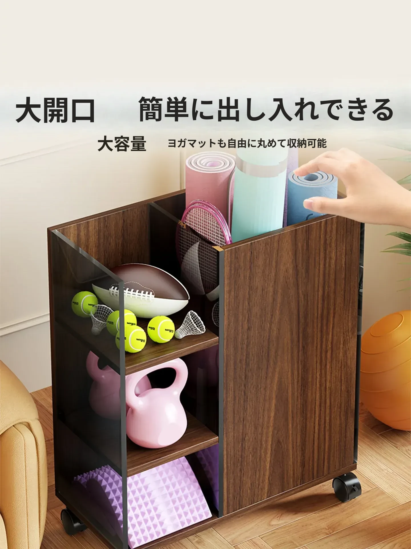 ヨガマット収納バスケット - スリムなフィットネス器具整理ツール!家での運動をスムーズに。バドミントンラケットも収納可能な便利なラックで、すっきりとした空間を実現!