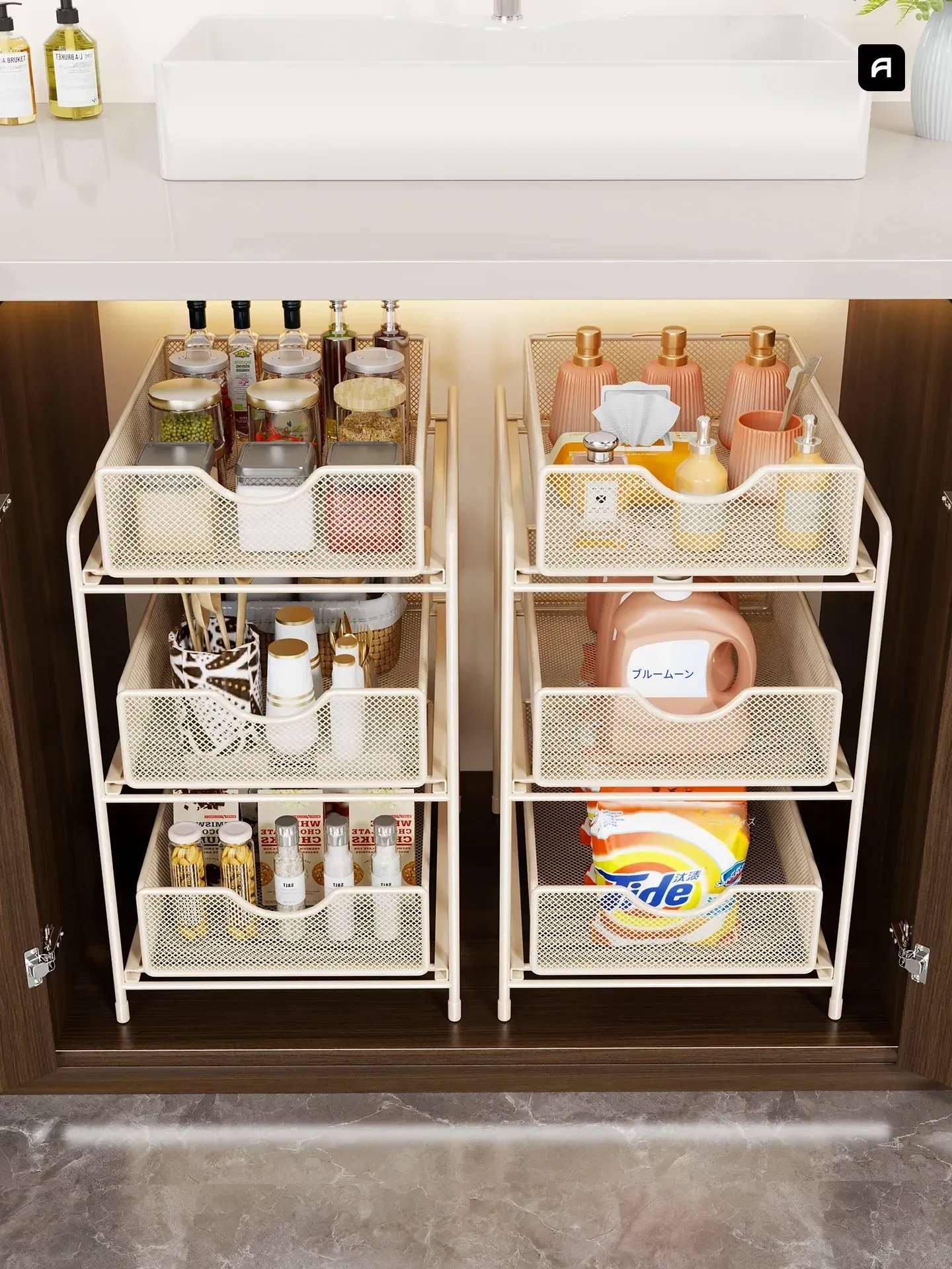 洗面台下の引き出し式収納ラック - バスルームの必需品をすっきり整理!シャワー用品やトイレタリーを簡単に収納できる多層型キャビネット。スペースを有効活用して、生活空間をより快適に!