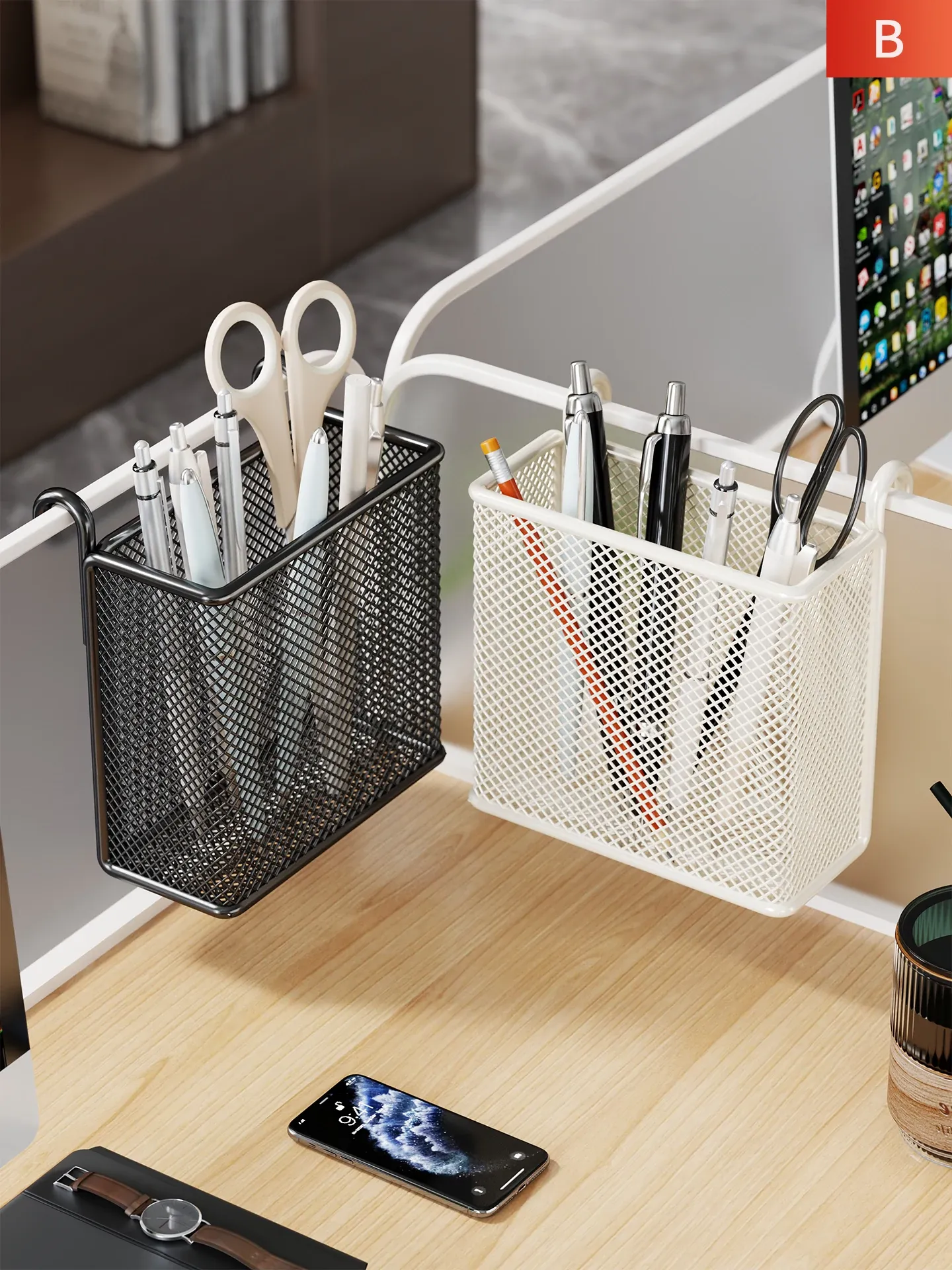 オフィスデスク用吊り収納ラック - 多機能フック&バスケット付き整理棚で、デスク周りをスッキリ整理!仕事効率をアップさせる便利アイテム!